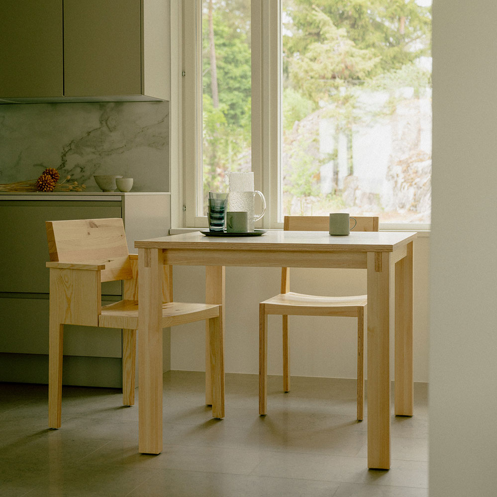 vaarnii mit Sitz in Finnland verwendet primär lokale Werkstoffe, vor allem - wie bei dieser Möbelserie – die finnische Waldkiefer (Pinus Sylvestris). Die Kiefer ist in Finnland die am meisten vorkommende Baumart, vaarnii achtet darauf, dass das verwendete Holz nur aus nachhaltigen Wäldern stammen. Da die Waldkiefer, im Gegensatz zur kultivierten Kiefer, sehr langsam wächst, ist das Holz um so härter und langlebiger und somit für die Produktion anspruchsvoller Möbel bestens geeignet. Neben der Nutzung rein heimischer Materialien setzt vaarnii auch auf lokale Produktion, dafür arbeitet der Hersteller mit einer kleinen Anzahl an lokalen Handwerkern und Manufakturen und zusammen.