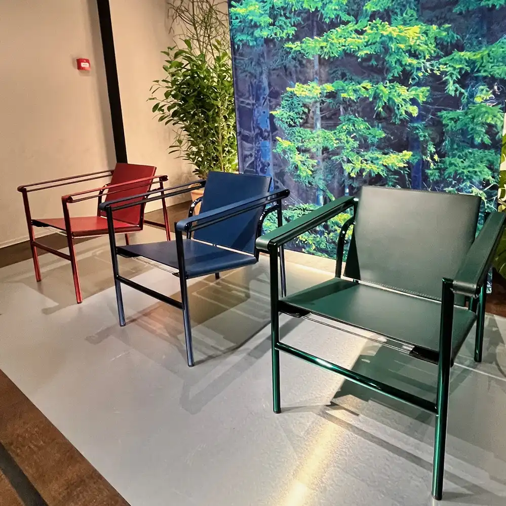 Die zeitlich limitierte Edition des LC1 Sessels erscheint im Rahmen des 60jährigen Jubiläums der Kollektion bei Cassina. Im Jahr 1964 erwarb Cassina die Rechte an vier ikonischen Möbeln von Le Corbusier, Pierre Jeanneret und Charlotte Perriand, die dann iein Jahr später in Serienproduktion gingen. Bei der Sonderedition ist das Sattelleder mit dem farbig verchromtem Gestell farblich Ton in Ton abgestimmt.