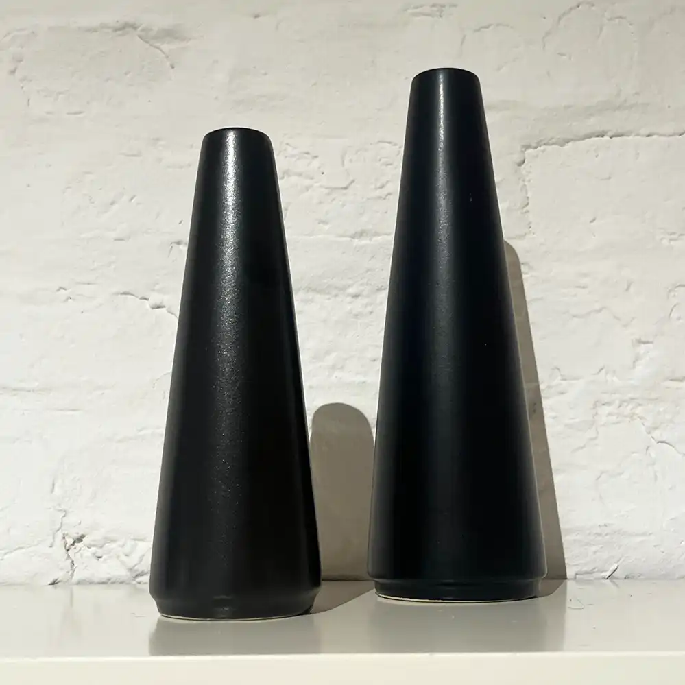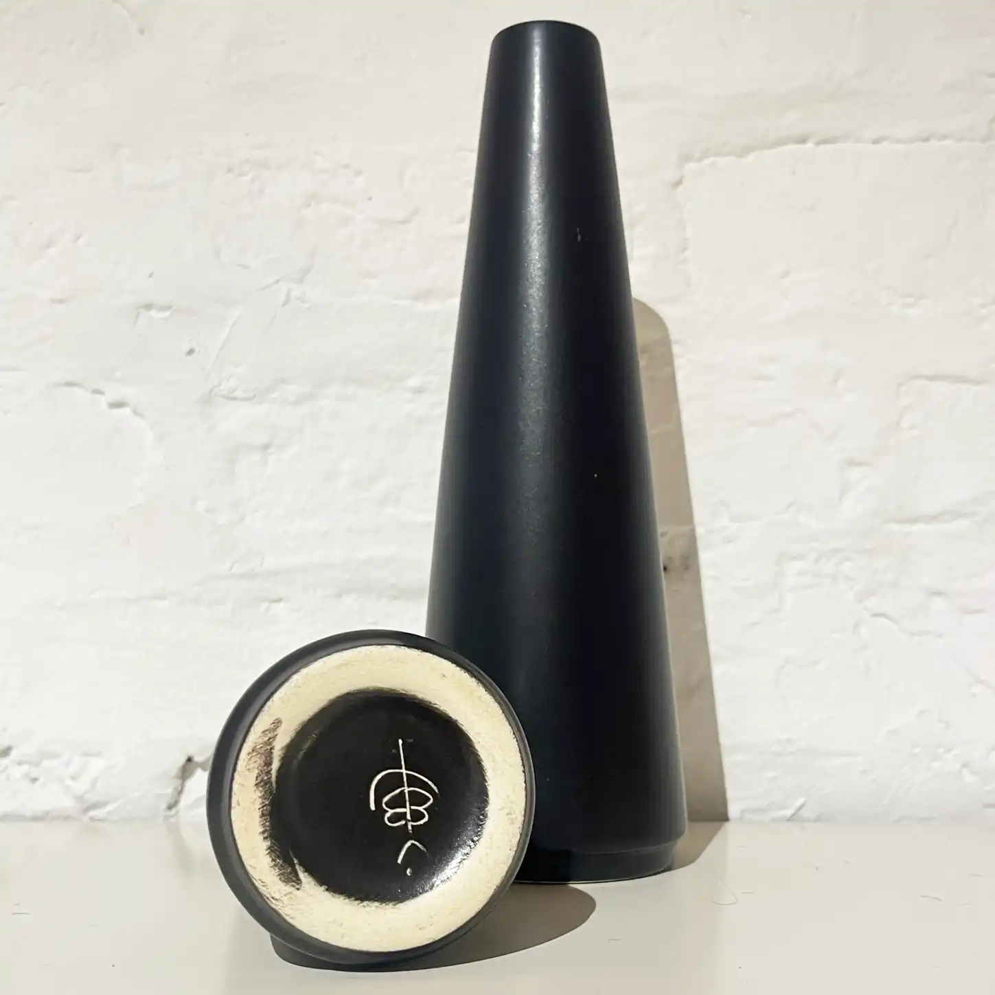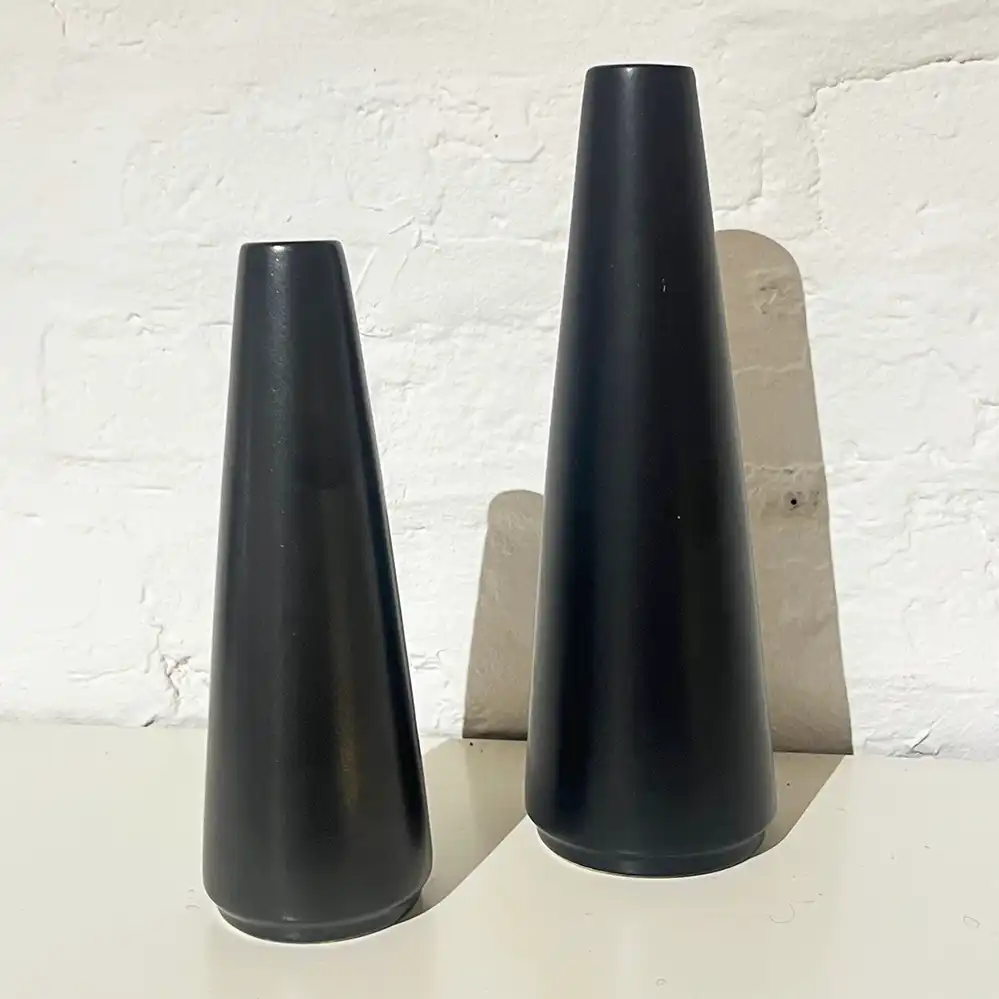 Anfang der 1950er Jahre entwarf Jan Bontjes van Beek für die Manufaktur „Keramisches Werk Dr.-Ing. Alfred Ungewiß” eine umfangreiche Keramikserie mit primär schwarzen oder weißen Glasuren. Die hier angebotenen zwei Vasen waren Bestandteil unserer Jan Bontjes van Beek Ausstellung 2022