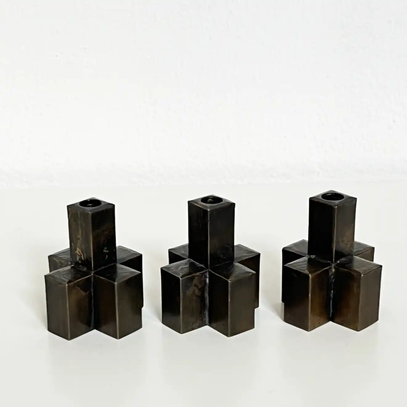 Die drei Kerzenständer aus massiver Bronze sind ein Design der Kunstschmiede Bergmeister in Ebersberg aus den 1960er Jahren. Der Preis gilt für das Set.