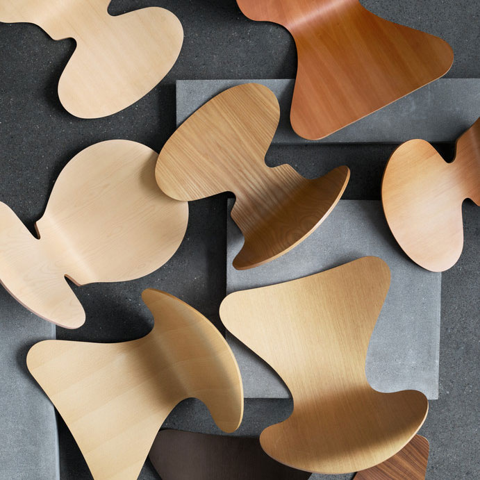 - Schichtverleimte, formgepresste Schale in sechs Holzfurnieren: Buche, Esche, Kirsche, Eiche, Eiche dunkel und Nussbaum, klar lackiert