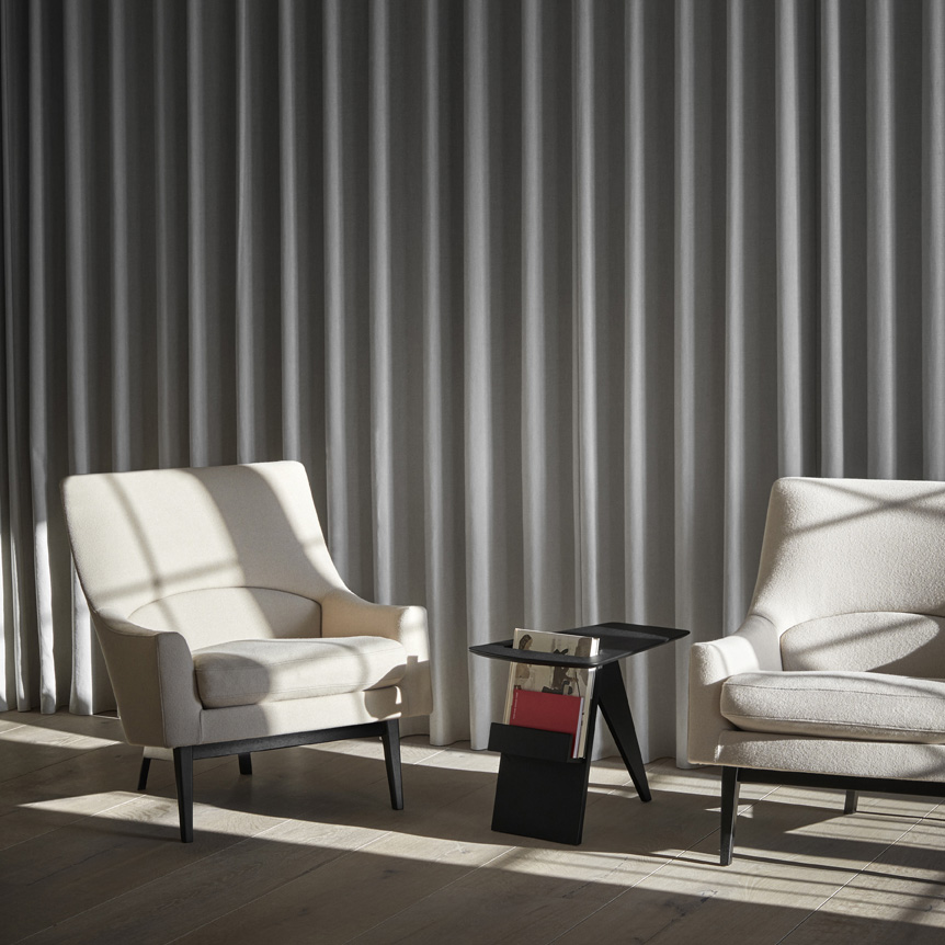Den A-Chair mit der besonders prägnanten Silhouette entwarf Jens Risom Anfang der 1960er Jahre für seine eigene Firma Jens Risom Design (JRD), die letzte Abbildung zeigt den Designer mit seinem Entwurf. 2019 wurde der Sessel im Rahmen der Fredericia Risom Kollektion neu aufgelegt, das Design wurde direkt als Comeback des Jahres mit dem dänischen Design Award ausgezeichnet. Erhältlich ist der A-Chair bei Markanto exemplarisch mit dem Stoff Hallingdal von Kvadrat, weitere Stoffe oder Leder gerne auf Anfrage.