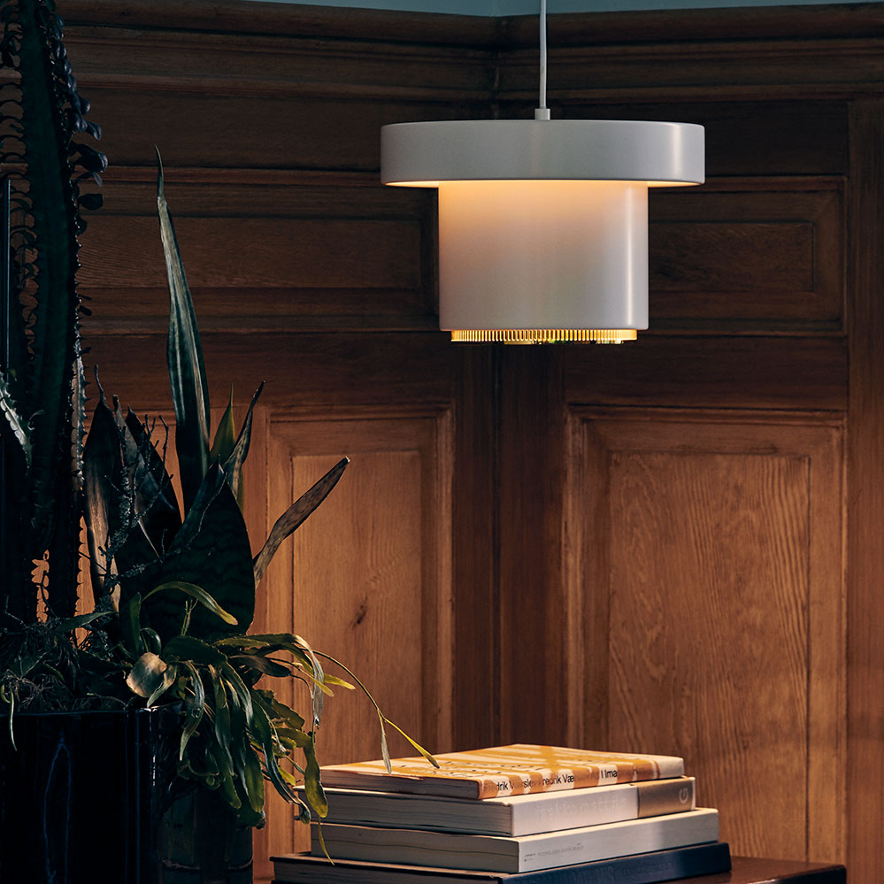 Die A201 Pendelleuchte entwarf Alvar Aalto in den 1950er Jahren für die Stadthalle in Säynätsalo, die Formgebung nimmt Elemente seiner berühmten Handgranate-Lampe wie den Messingring mit auf. Neben der 2019 von Artek neu aufgelegten Single-Leuchte entwarf der finnische Architekt auch Doppel- und Dreifachleuchten des gleichen Typs (siehe letzte Abbildung, dort im Wohnhaus des Architekten).
