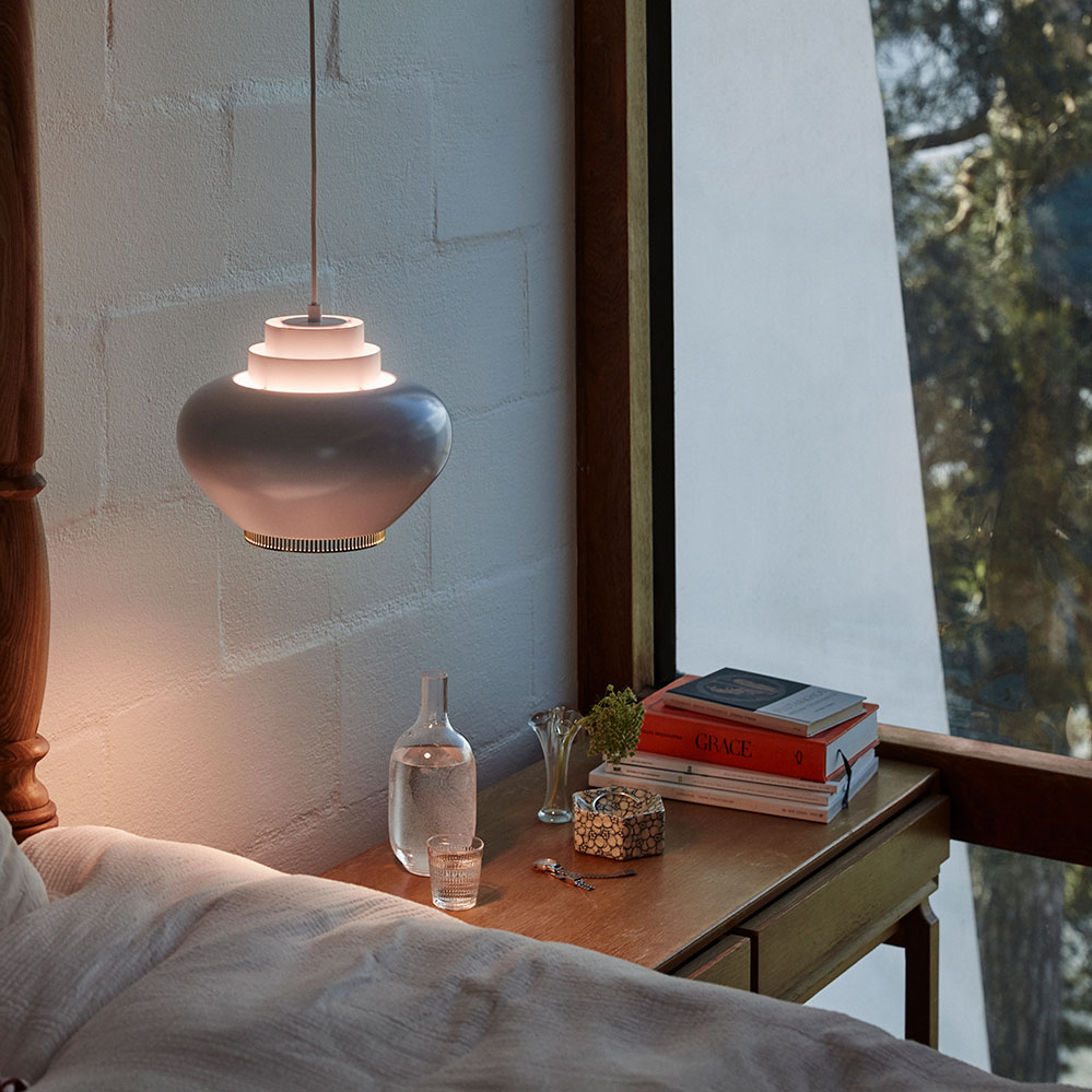 Eine eher unbekanntere Leuchte von Alvar Aalto ist das Modell A333 Turnip aus den 1950er Jahren. Gestalterisch greift die Pendelleuchte Elemente seiner Lichtklassiker Golden Bell und Bienenkorb auf. Lieferbar ist die Artek Leuchte mit einem Messingring oder alternativ mit einem weiß lackierten Stahlring.