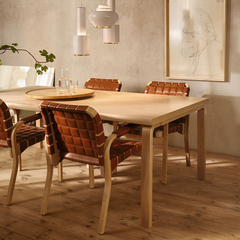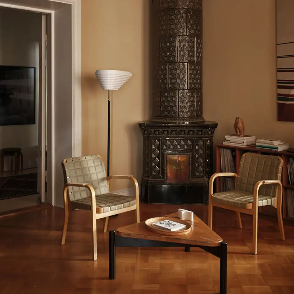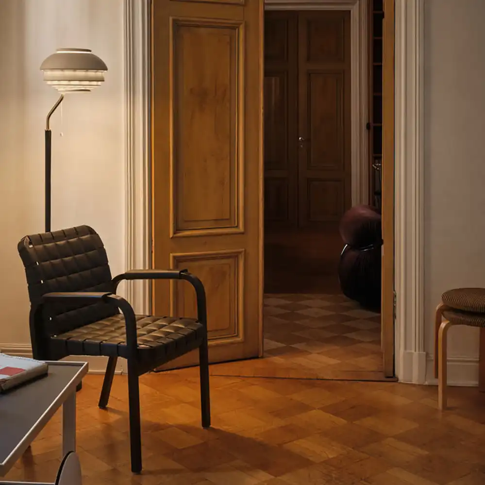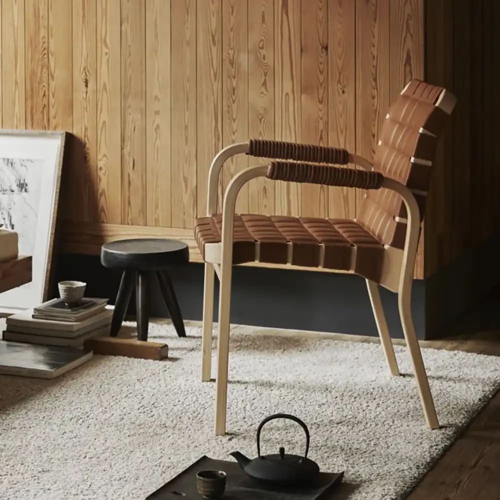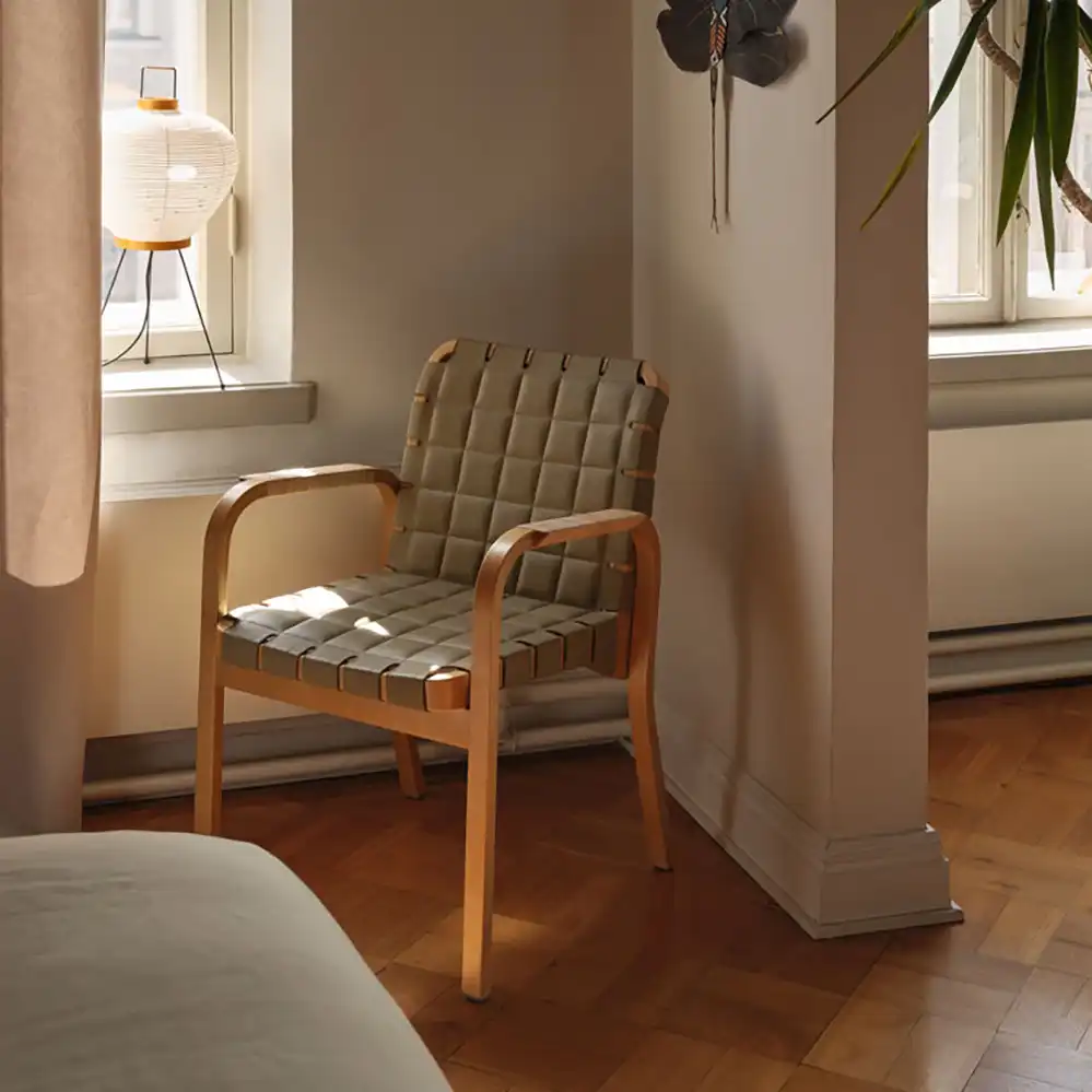 Der Sessel 45 von Alvar Aalto kann sowohl als Stuhl an einem Tisch wie als Sessel fungieren. Entworfen wurde das Möbel im Jahr 1947 und 2024 von Artek in ausgewählten Beauty-Versionen in zeitgemäßen Maßen neu aufgelegt. Selbstverständlich sind neben diesen Beauty Versionen auf Anfrage auch individuelle Ausführungen erhältlich. Der Architekt verwendete den Sessel 45 auch selbst in seinem Atelier in Helsinki (siehe letztes Foto). Ein besonderes Detail sind auch die vier möglichen Ausführungen der Armlehnen, wahlweise nur Birke, oder mit Rattan- und Lederschnüren ummantelt oder mit einer Lederauflage. Die vier Beauty-Ausführungen sind wie folgt: