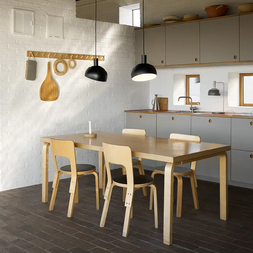 Der Entwurf des rechteckigen Aalto Esstisch 86 entstand im Jahr 1935. Ein Jahr später entwickelte der finnische Architekt eine noch größere Variante mit 240 cm Länge (das Modell 86B, gerne auf Anfrage). Seit 2017 beträgt die Tischhöhe der Aalto Tische bei Artek einheitlich 74 cm.