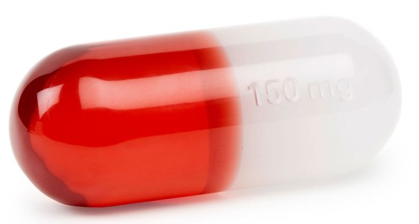 Die kleine Acrylic Pill in Form einer 17 cm langen Tablette ist wahlweise in Gelb oder Rot lieferbar. Gedacht ist es, verschiedene Tabletten-Skulpturen miteinander als ungewöhnliche Dekoration zu kombinieren.