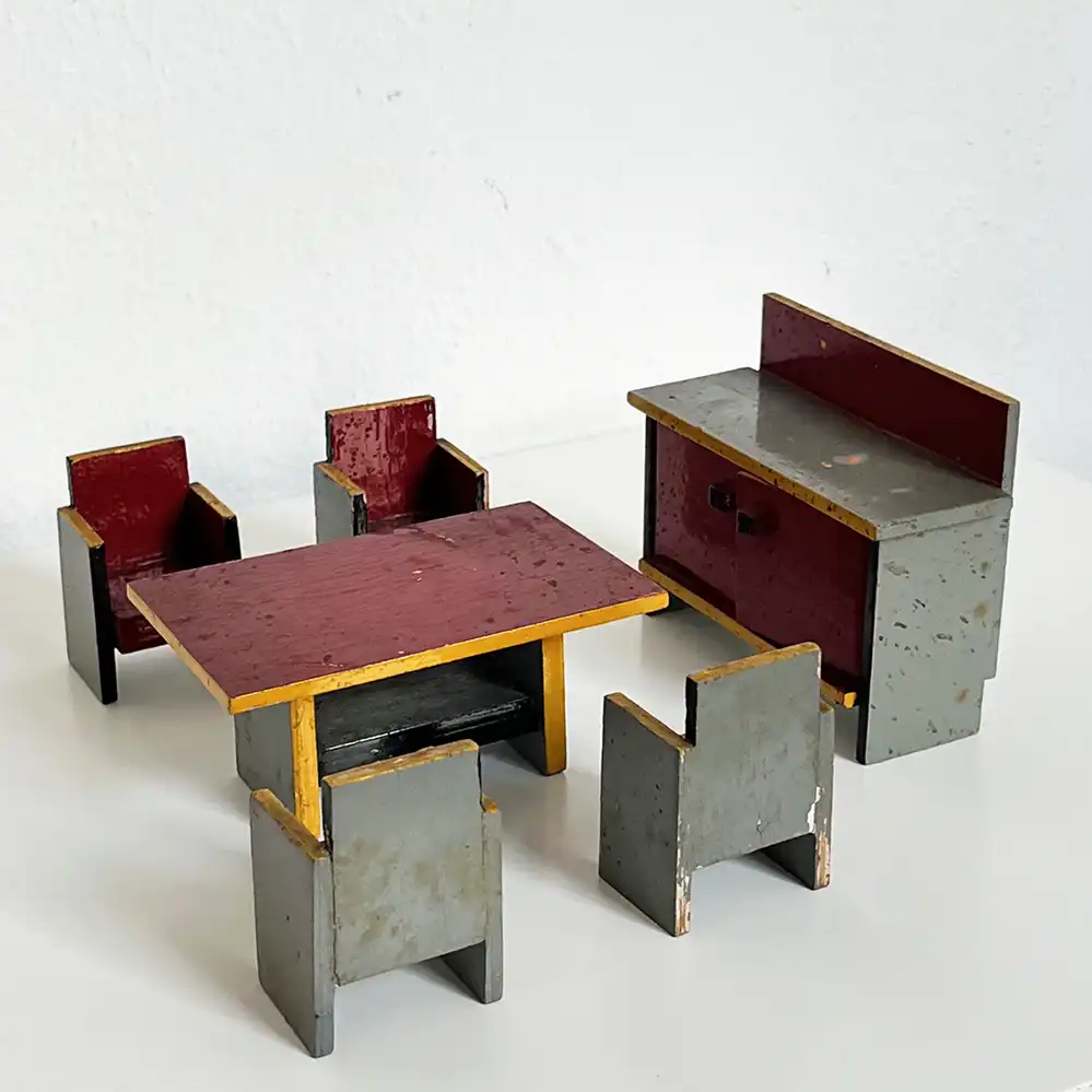 Das sechsteilige Spielzeugset im Stil der Moderne wurde in den 1920er oder 1930er Jahren von dem niederländischen Designer Ko Verzuu (eigentlich Jacobus Johannes Josephus Verzuu) für Ado entworfen und befand sich u.a. in dem berühmten ADO Möbeltransportwagen. Auf der Internetseite adospeelgoed.com finden übrigens Interessierte ein sehr umfangreiches und geanues Nachschlagewerk zu den ganzen Ado-Produkten seit den 1920er Jahren,