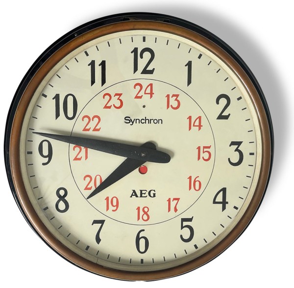 Um 1910 entwarf Peter Behrens für die AEG die Synchronuhr in zwei Größen (30 cm und 50 cm). Die hier angebotene Wanduhr ist die seltene große Variante mit 50 cm Durchmesser und in einem sehr guten Zustand (bei den meistens Uhren ist die rote Typografie nach 100 Jahren verblasst.