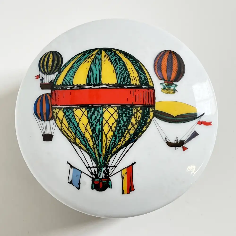 In den 1970er Jahren kam es zu einer Zusammenarbeit zwischen Piero Fornasetti und Rosenthal, wobei verschiedene Entwürfe dann in Deutschland gefertigt wurden. Exemplarisch die Deckeldose mit den Fornasetti Montgolfiere-Motiven, diese wurde wohl in den 1980er Jahren von Rosenthal in Selb gefertigt.
