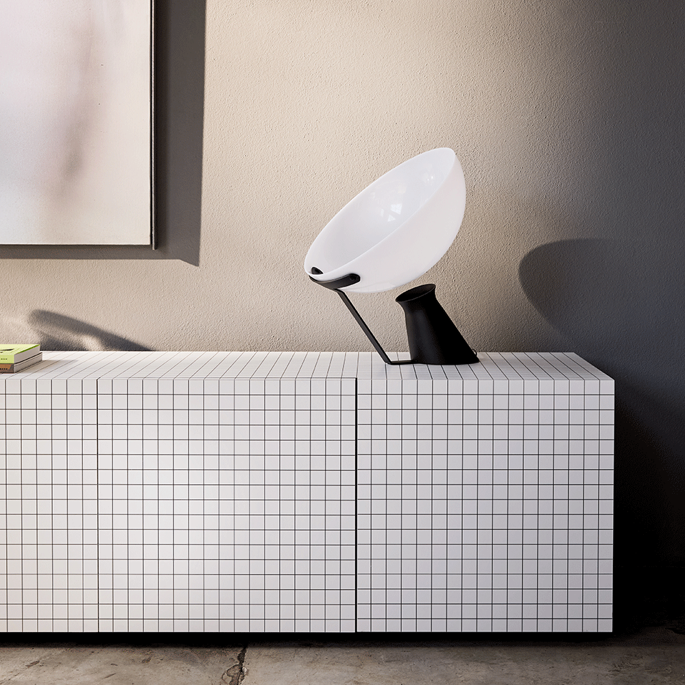 Die Aida Tischleuchte ist eine der charakteristischsten Lampen von Angelo Mangiarotti. Der Entwurf aus dem Jahr 1988 weist eine gewisse Spannung auf, die sich durch das Zusammenspiel des großen Reflektors aus Acrylglas mit dem relativ kleinen Fuß ergibt. Dabei bezieht sich Angelo Mangiarotti auf seine Architekturentwürfe – schlanke, elegante Säulen, welche ein Decke mit fast unmöglicher Last tragen sollten. Die Aida Tischleuchte, hergestelt von Karakter, erzeugt ein weiches indirektes Licht.