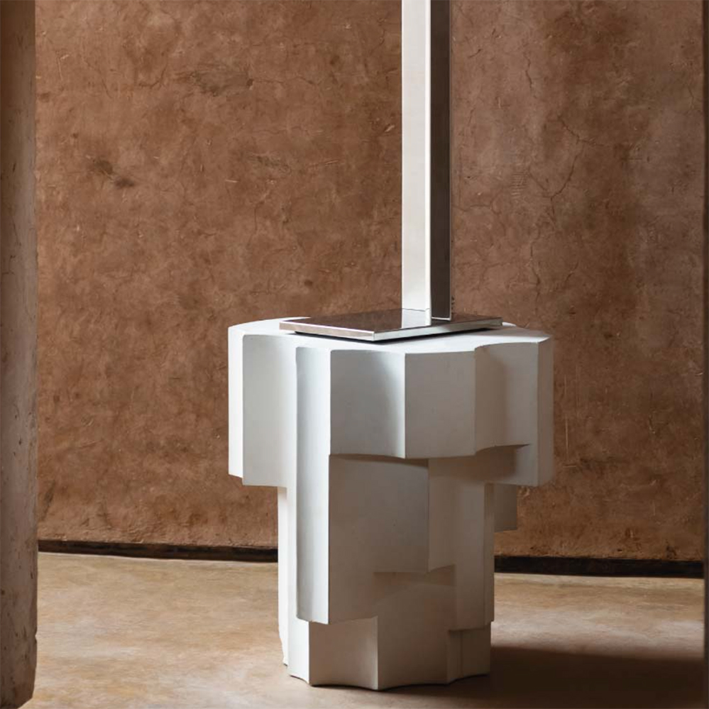 2023 entwarf das Designstudio EW Für Tacchini den skulpturalen Altar Beistelltisch, wahlweise erhältlich in Keramik, Zement oder Holz. Der Tisch überrascht durch seine Formgebung und die Materialität: