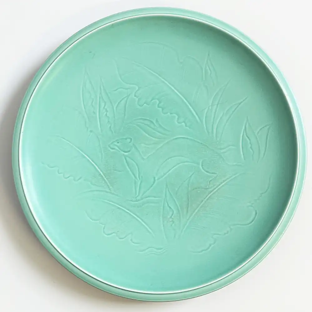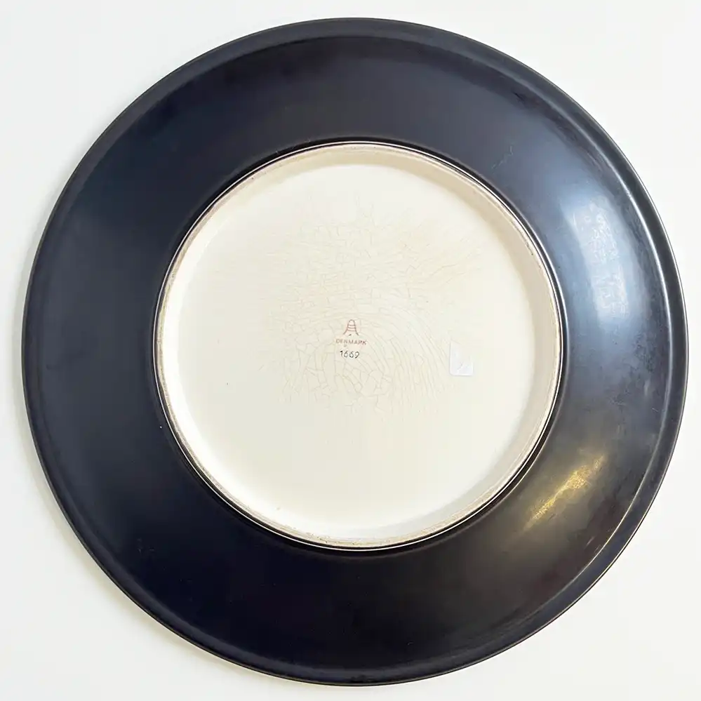 Mit 36 cm Durchmesser ist die Schale 1669 des schwedisch-dänischen Keramikers und Künstlers Nils Thorsson sehr beeigndruckend, das Motiv zeigt einen Marder. Leicht hat die Schale parziell dunkle Abfärbungen in der Seladon-Glasur.