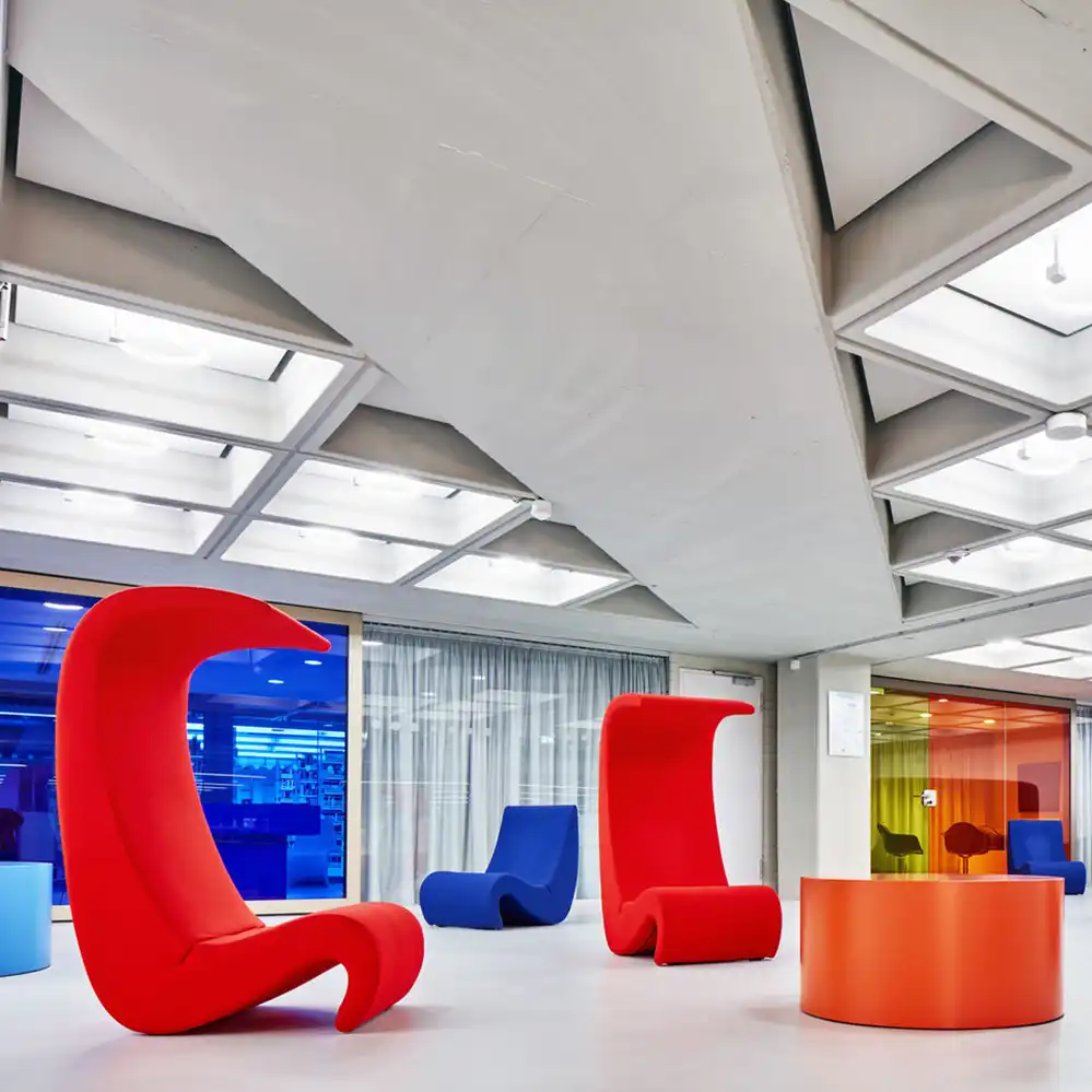 Der Sessel Amoebe ist ein gelungenes Beispiel für ein bodennahes Loungemöbel und verkörpert mit seinen kräftigen leuchtenden Farben den fröhlich-frechen Zeitgeist der frühen 1970er Jahre. Dank einer flexiblen Rückenschale ist der Sitzkomfort der Reedition von Vitra nochmals verbessert worden.