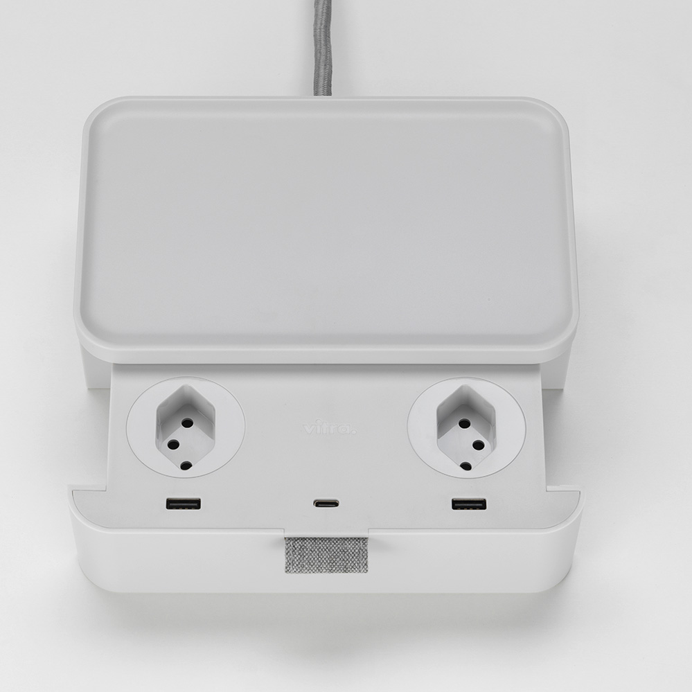 In geschlossenem Zustand ist das Ladegerät von Vitra (in Zusammenarbeit mit Layer Design) ein sorgfältig gestaltetes, wohlproportioniertes Objekt, dessen Funktion nicht auf den ersten Blick zu erkennen ist. Die Oberfläche dient dabei als Wireless-Charger für Ihr Smartphone. Ist die vordere Front herausgezogen, bietet das Schubfach in seinem Innern zwei Strom- und zwei USB-A-Anschlüsse sowie einen USB-C-Anschluss. So lässt sich im Homeoffice jeder Tisch im Handumdrehen zu einem elektrifizierten Arbeitsplatz machen und im Büro gewährleistet Ampi die heute notwendige Flexibilität ohne aufwendige Tischvorbereitung und Verkabelung. Ampi steht auf einem rutschfesten Boden und ist wahlweise in hellgrau oder schwarz erhältlich.