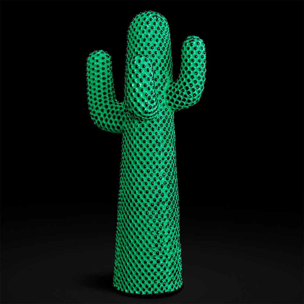 1972 entwarfen Guido Drocco und Franco Mello den berühmten Cactus. Als ironisches Totem verkörpert er die Gestaltungsideen und den Gestaltungshumor dieser Ära in den 1970er Jahren. Das ikonische Objekt kann als Garderobe oder als dekoratives Element verwendet werden. Das ursprüngliche Konzept von Gufram sah immer vor, dass der Cactus in limitierten Editionen in einer Farbgebung produziert wird. Gefertigt aus flexiblem Polyurethanschaum ist der Cactus weich und dornlos. Der Designklassiker ist dabei gleichzeitig ein Garant für Aufmerksamkeit, welcher in den renommiertesten Kunst- und Designmuseen der Welt gezeigt wird. Die Herstellung erfolgt dabei bei Gufram in aufwendiger Handarbeit. Jede der 2.165 Spitzen, die die Oberfläche des Cactus charakterisieren, werden von Facharbeitern manuell nachgebessert und später mit Guflac, einer von Gufram patentierten Farbbeschichtung, versehen.