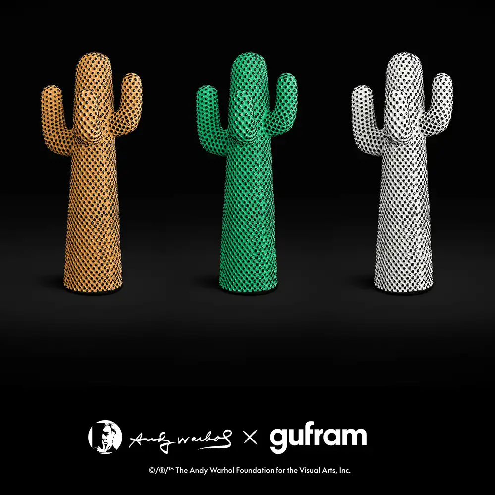 2025 legt Gufram zusammen mit der Andy Warhol Foundation eine zweite Edition des berühmten Cactus auf, die sich in drei neuen Farben (grün, orange und weiß) präsentiert. Wie auch bei der ersten Edition, die sehr schnell vergriffen war, sind die 2.165 Spitzen in Schwarz hervorgehoben.