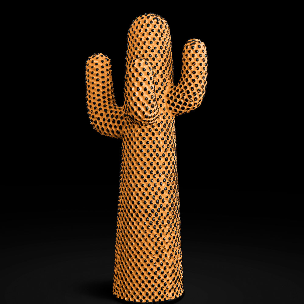 1972 entwarfen Guido Drocco und Franco Mello den berühmten Cactus. Als ironisches Totem verkörpert er die Gestaltungsideen und den Gestaltungshumor dieser Ära in den 1970er Jahren. Das ikonische Objekt kann als Garderobe oder als dekoratives Element verwendet werden. Das ursprüngliche Konzept von Gufram sah immer vor, dass der Cactus in limitierten Editionen in einer Farbgebung produziert wird. Gefertigt aus flexiblem Polyurethanschaum ist der Cactus weich und dornlos. Der Designklassiker ist dabei gleichzeitig ein Garant für Aufmerksamkeit, welcher in den renommiertesten Kunst- und Designmuseen der Welt gezeigt wird. Die Herstellung erfolgt dabei bei Gufram in aufwendiger Handarbeit. Jede der 2.165 Spitzen, die die Oberfläche des Cactus charakterisieren, werden von Facharbeitern manuell nachgebessert und später mit Guflac, einer von Gufram patentierten Farbbeschichtung, versehen.