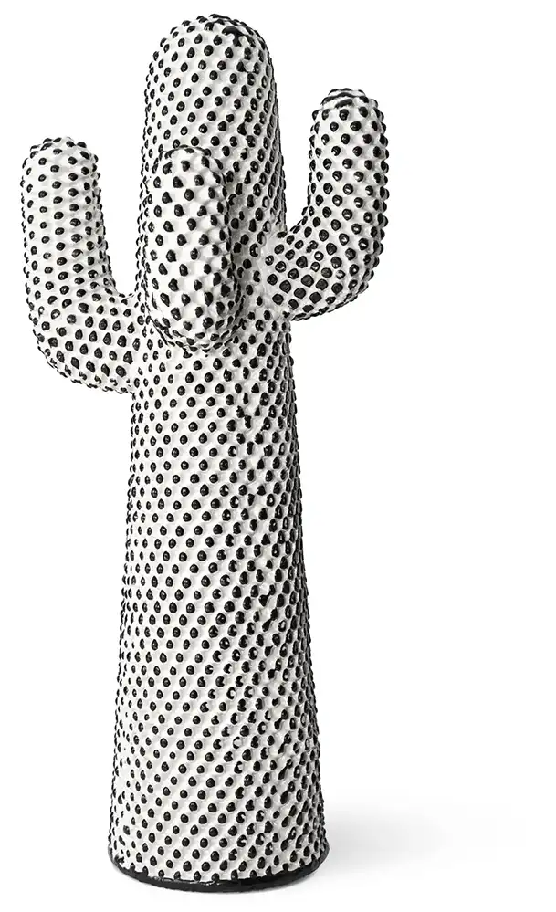 1972 entwarfen Guido Drocco und Franco Mello den berühmten Cactus. Als ironisches Totem verkörpert er die Gestaltungsideen und den Gestaltungshumor dieser Ära in den 1970er Jahren. Das ikonische Objekt kann als Garderobe oder als dekoratives Element verwendet werden. Das ursprüngliche Konzept von Gufram sah immer vor, dass der Cactus in limitierten Editionen in einer Farbgebung produziert wird. Gefertigt aus flexiblem Polyurethanschaum ist der Cactus weich und dornlos. Der Designklassiker ist dabei gleichzeitig ein Garant für Aufmerksamkeit, welcher in den renommiertesten Kunst- und Designmuseen der Welt gezeigt wird. Die Herstellung erfolgt dabei bei Gufram in aufwendiger Handarbeit. Jede der 2.165 Spitzen, die die Oberfläche des Cactus charakterisieren, werden von Facharbeitern manuell nachgebessert und später mit Guflac, einer von Gufram patentierten Farbbeschichtung, versehen.