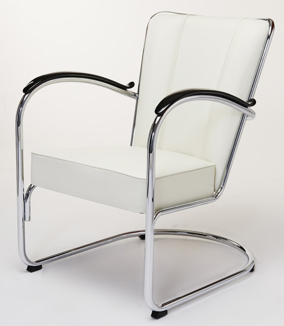 Den Freischwinger-Sessel 412S entwarf der niederländische Designer und Unternehmer Willem Gispen im Jahr 1934 - sichtlich beeinflusst von der Moderne in Deutschland. Vergleichbare Clubsessel wurden damals auch von deutschen Herstellern wie Mauser, Desta und Thonet produziert.