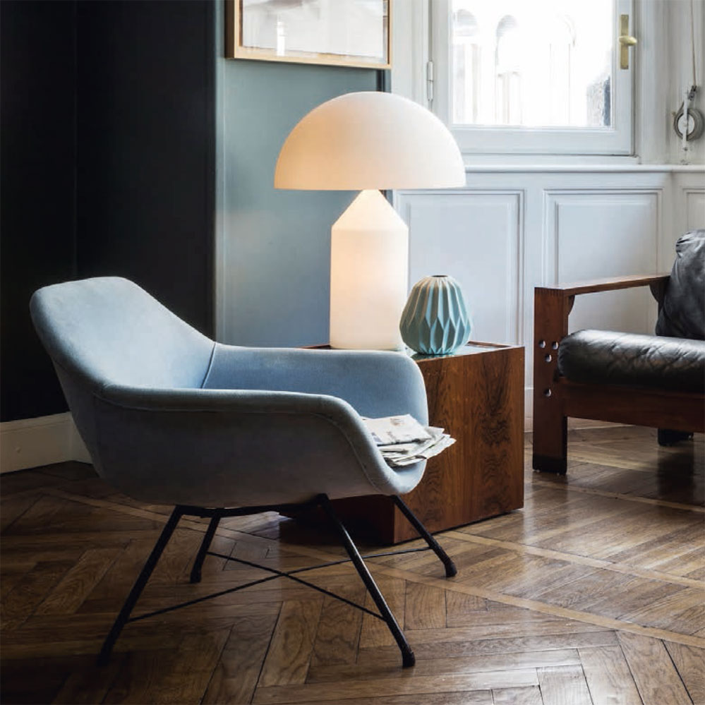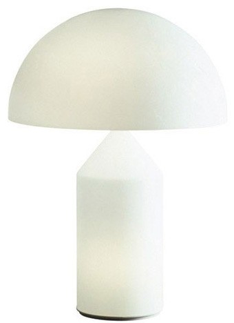 Der Entwurf der Atollo Leuchte von Vico Magistretti für Oluce erhielt im Jahr 1977 den rennomierten Designpreis Compasso d'Oro. Die Leuchtstellen (einmal im Fuß, einmal im Schirm) sind dabei getrennt schaltbar. Erhältlich ist die Opalglas-Variante des Lichtklassikers in drei verschiedenen Größen: