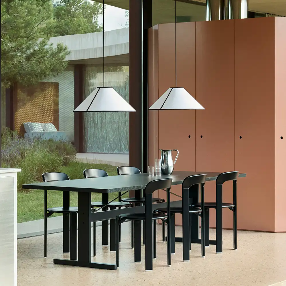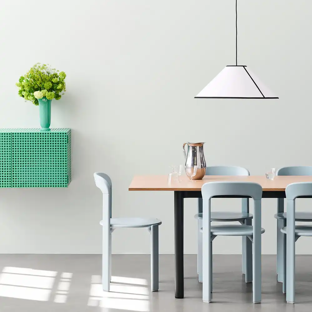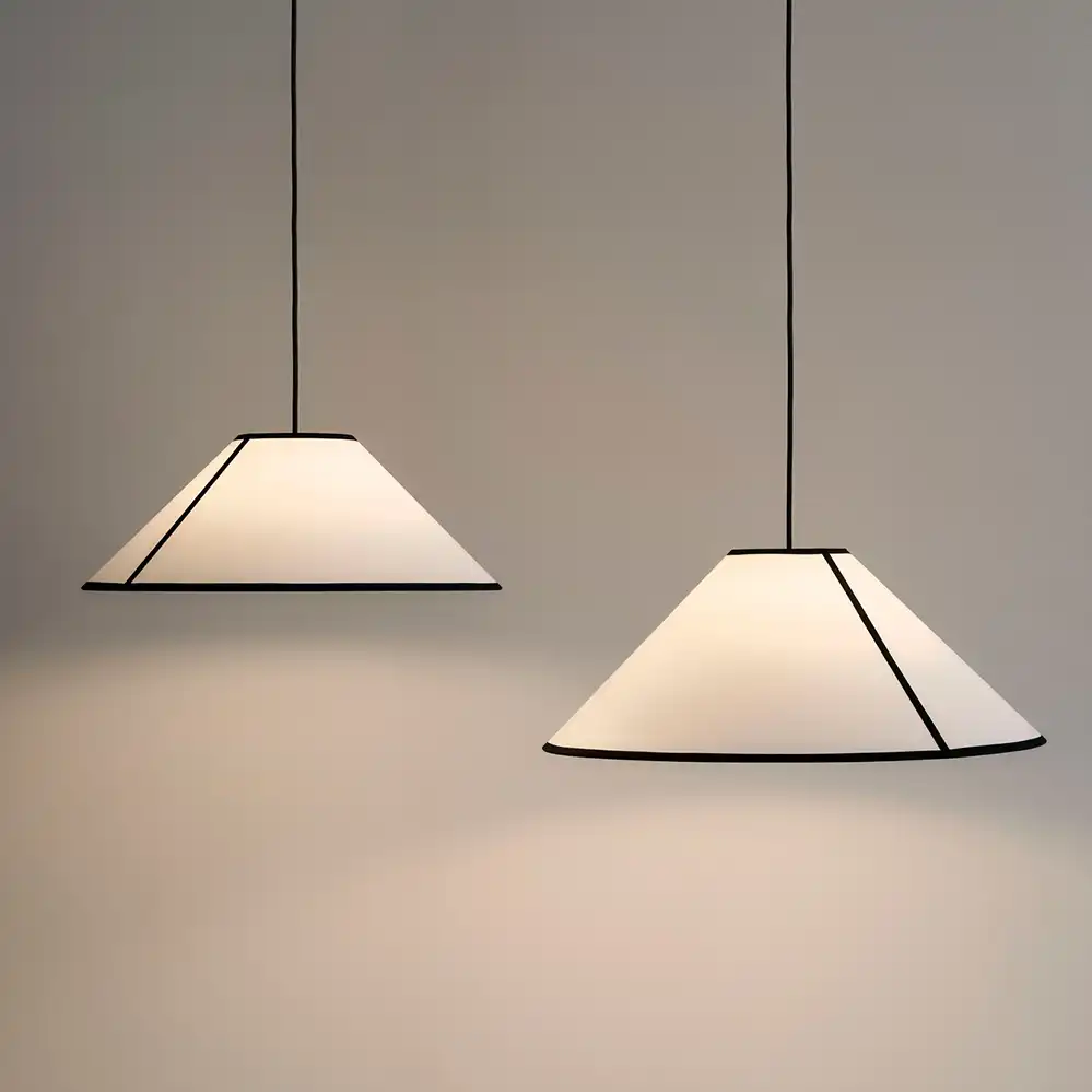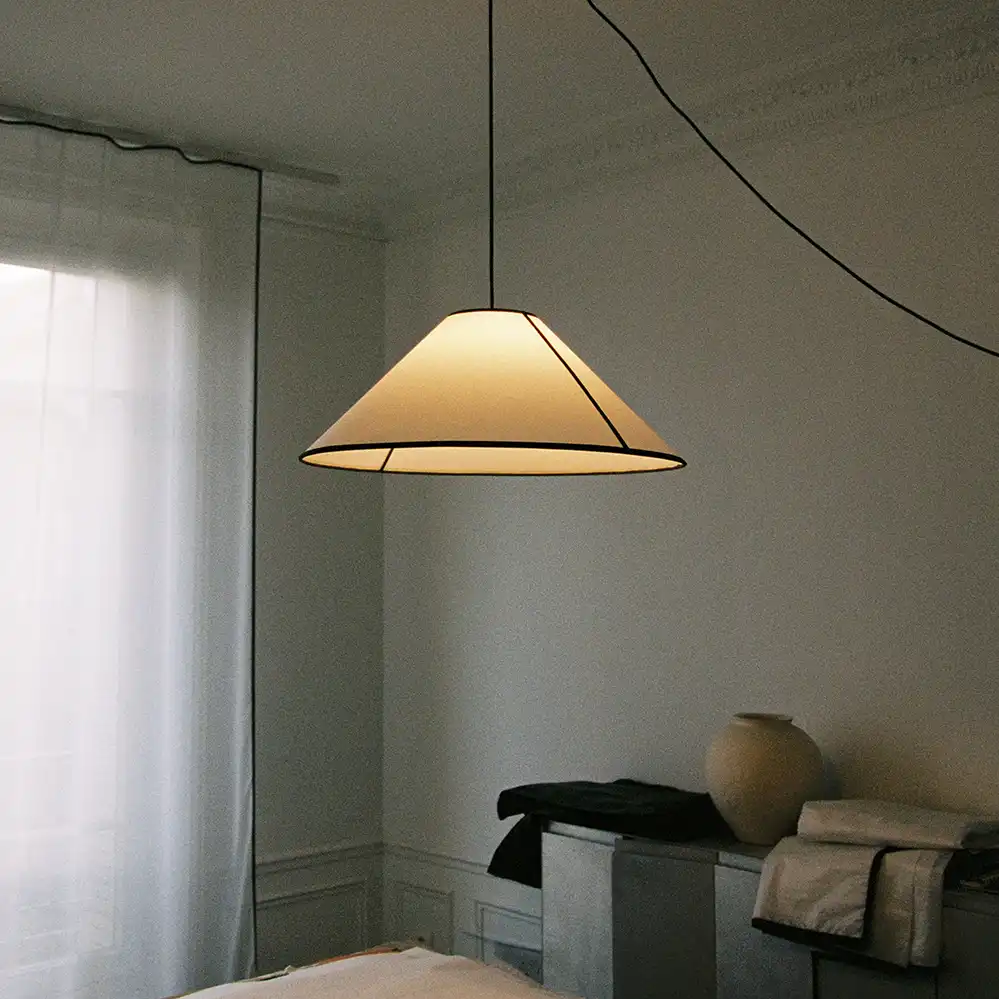 Die AVA Cone Pendelleuchte, entworfen von Ana Kraš für HAY, interpretiert die klassische Empire-Pendelleuchte in einem modernen, grafischen Design. Der konische Schirm besteht aus ECOPET™, einem Material aus recyceltem PET-Kunststoff, und besitzt eine halbtransparente, papierähnliche Struktur, die durch kontrastierende Stoffpaspeln akzentuiert wird.