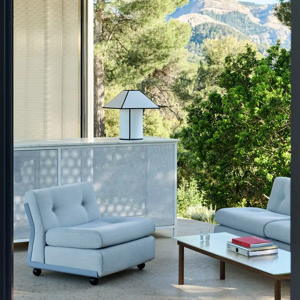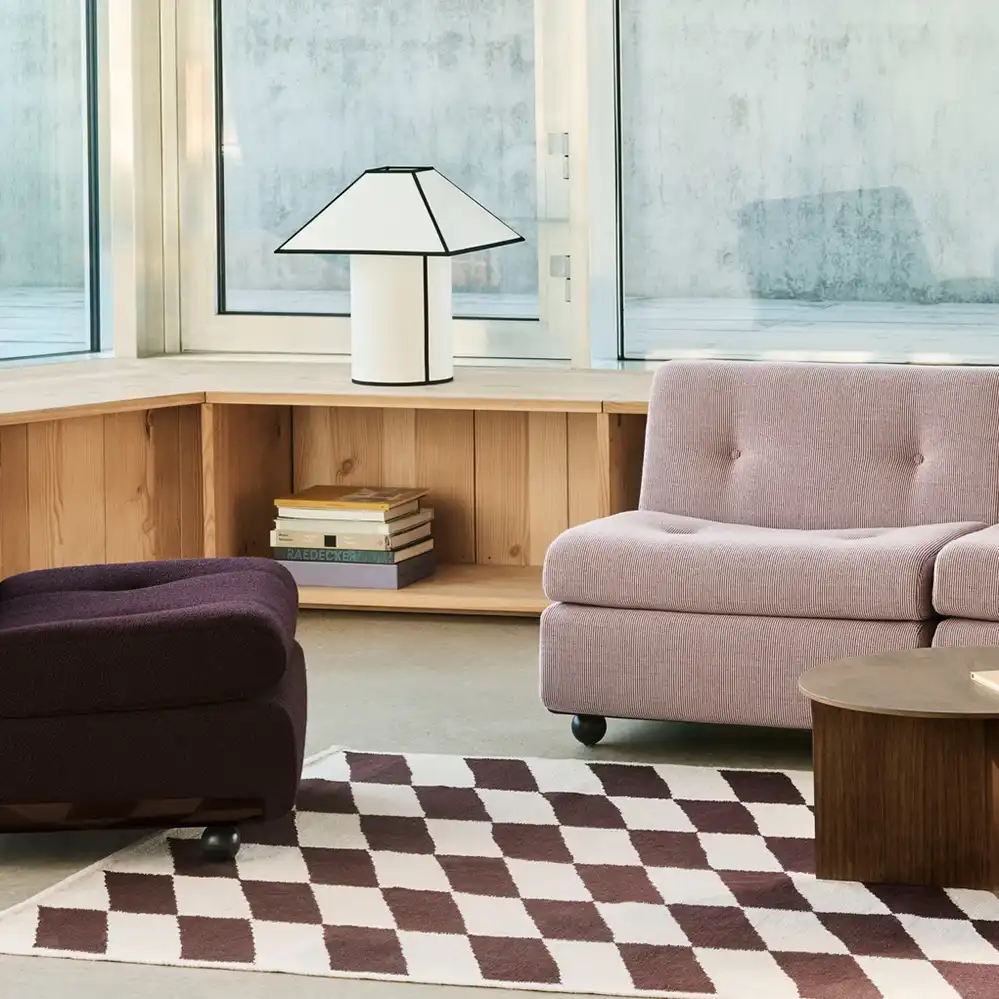 Die AVA Pyramid Tischlampe, entworfen von Ana Kraš für HAY, verbindet eine klassische Lampenform mit einem modernen, grafischen Design. Gefertigt aus ECOPET™, einem Material aus recyceltem PET-Kunststoff, verfügt die Lampe über einen halbtransparenten Sockel und Schirm mit strukturierter Oberfläche, ergänzt durch kontrastierende Stoffpaspeln. Die AVA Pyramid erzeugt ein sanftes, atmosphärisches Licht und fügt sich harmonisch in verschiedene Wohnbereiche ein