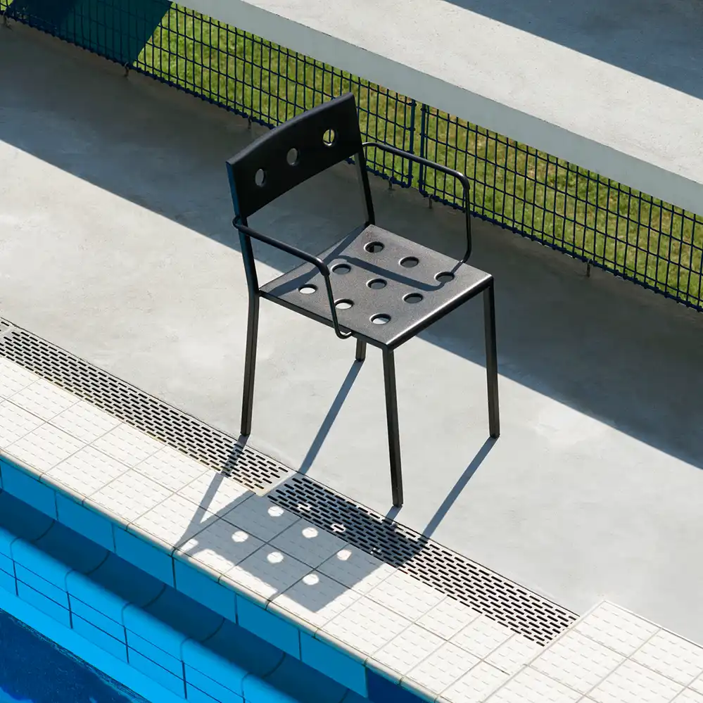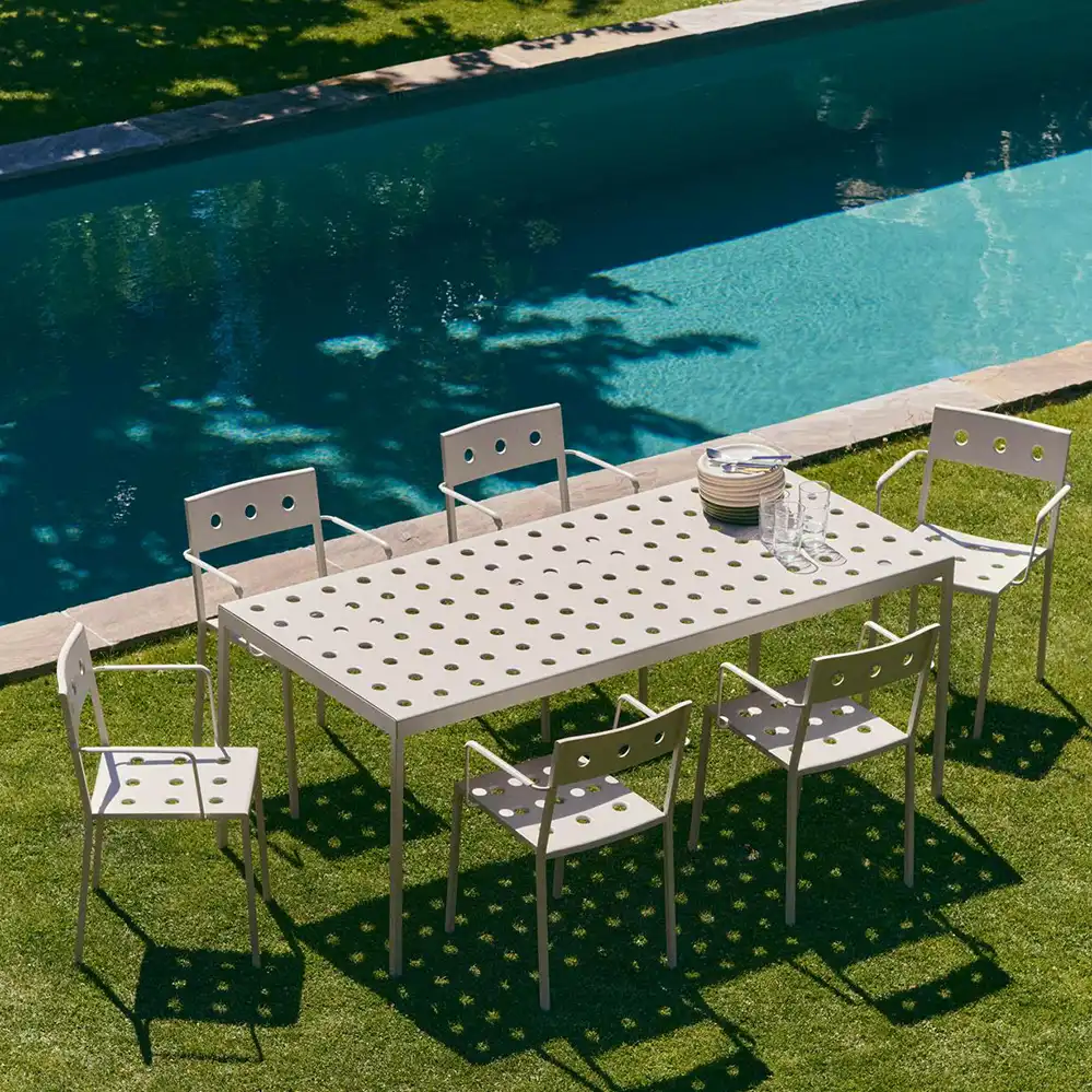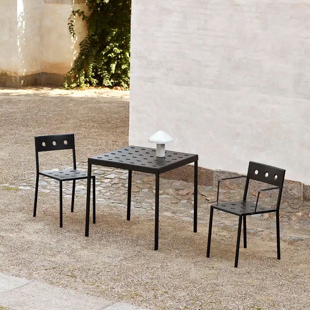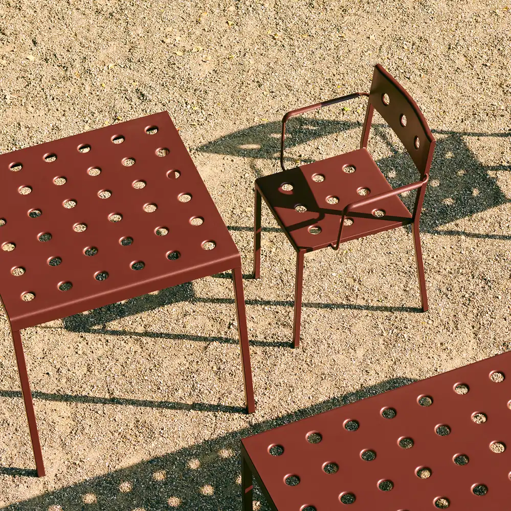 Der Balcony Armchair, entworfen von Ronan und Erwan Bouroullec für HAY, ist ein eleganter und funktionaler Outdoor-Dining-Stuhl mit integrierten Armlehnen für zusätzlichen Komfort. Die klare, quadratische Form wird durch eine sanft gerundete Rückenlehne ergänzt. Mehrere Öffnungen in Sitzfläche und Rücken sorgen für eine charakteristische Optik und erhöhen die Stabilität der Konstruktion. Gefertigt aus pulverbeschichtetem Stahl und mit einem Outdoor-Primer versehen, bietet der Armchair hohe Widerstandsfähigkeit und Langlebigkeit im Außenbereich.
