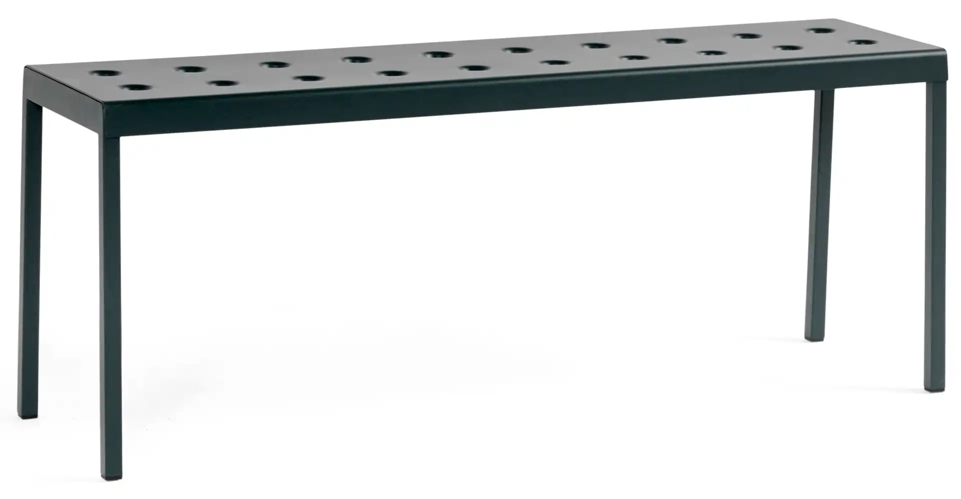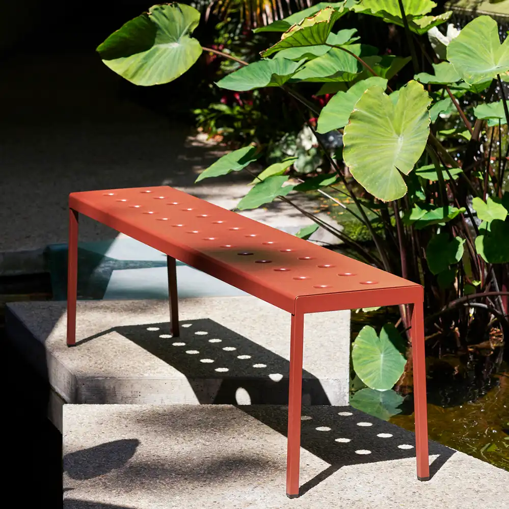 Die Balcony Bench, entworfen von Ronan und Erwan Bouroullec für HAY, ist eine elegante Sitzlösung für den Außenbereich. Die schlichte, rechteckige Form wird durch schlanke Beine ergänzt. Mehrere Öffnungen in der Sitzfläche sorgen für eine markante Optik und erhöhen die Stabilität der Konstruktion. Gefertigt aus pulverbeschichtetem Stahl und mit einem Outdoor-Primer versehen, bietet die Bank hohe Widerstandsfähigkeit und Langlebigkeit im Außenbereich. Sie ist in verschiedenen Farb- und Größenvarianten erhältlich und eignet sich dank ihres klaren Designs für unterschiedlichste Einsatzorte – von kleinen Balkonen und Terrassen bis hin zu Gärten und großzügigen Außenflächen.