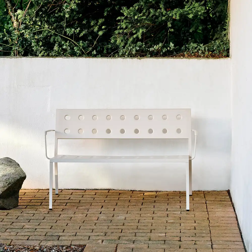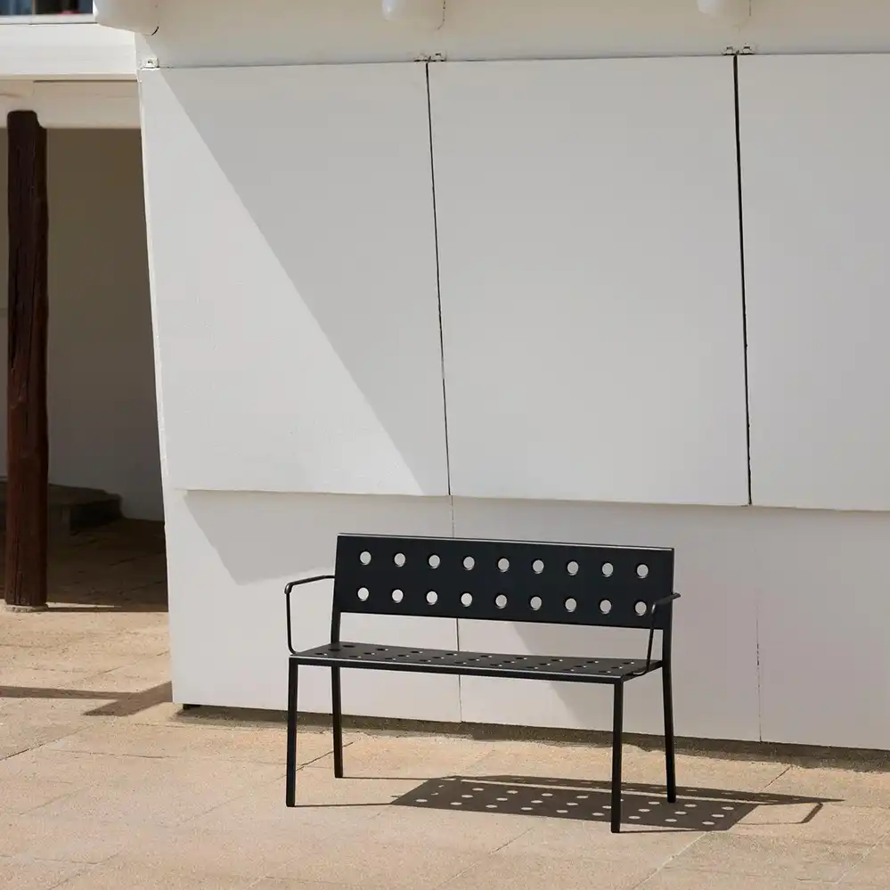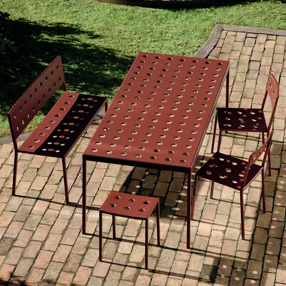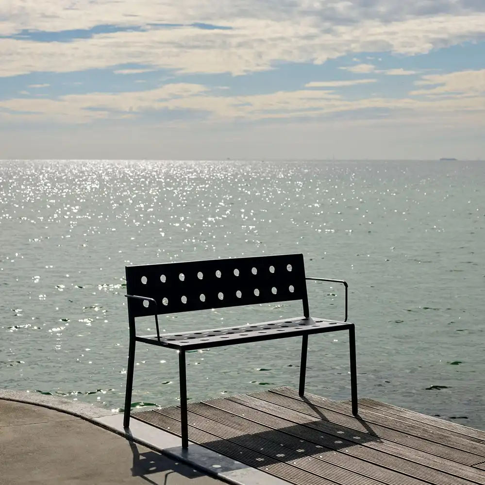 Die Balcony Dining Bench, entworfen von Ronan und Erwan Bouroullec für HAY, ist eine elegante und kompakte Sitzlösung für den Außenbereich. Die schlichte, rechteckige Form wird durch schlanke Beine ergänzt. Mehrere Öffnungen in Sitzfläche und Rücken sorgen für eine markante Optik und erhöhen die Stabilität der Konstruktion. Gefertigt aus pulverbeschichtetem Stahl und mit einem Outdoor-Primer versehen, bietet die Bank hohe Widerstandsfähigkeit und Langlebigkeit im Außenbereich. Die Balcony Dining Bench ist in verschiedenen Farb- und Größenvarianten erhältlich und wird wahlweise mit oder ohne Armlehnen angeboten. Dank ihres zeitlosen Designs eignet sie sich für unterschiedlichste Einsatzorte – von kleinen Balkonen und Terrassen bis hin zu Gärten und großzügigen Außenflächen.