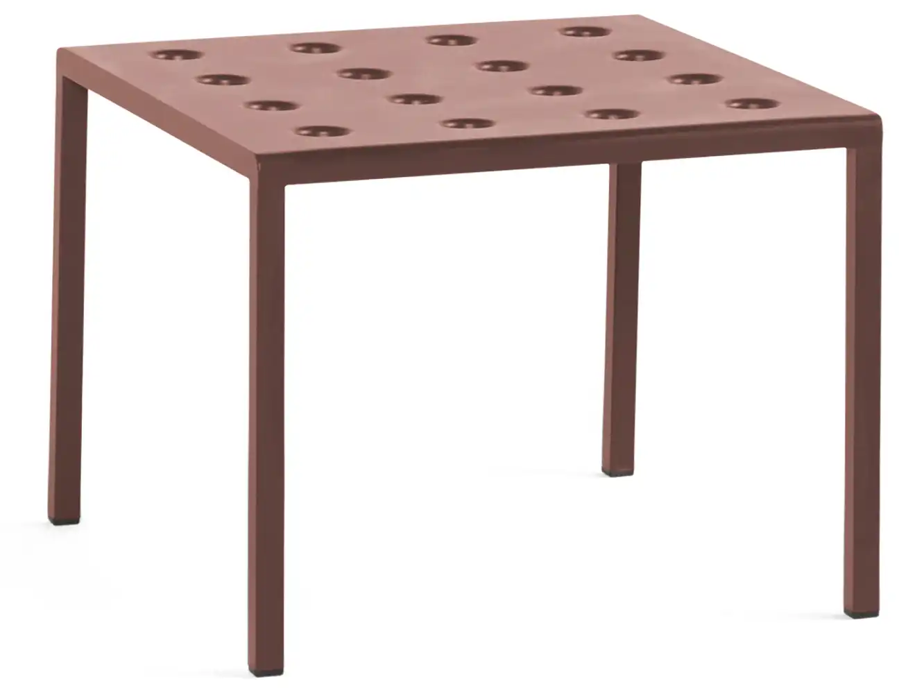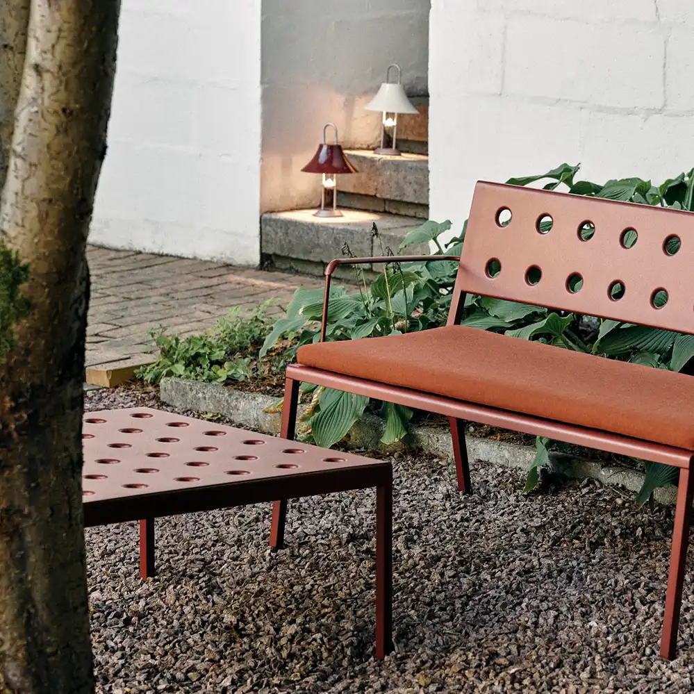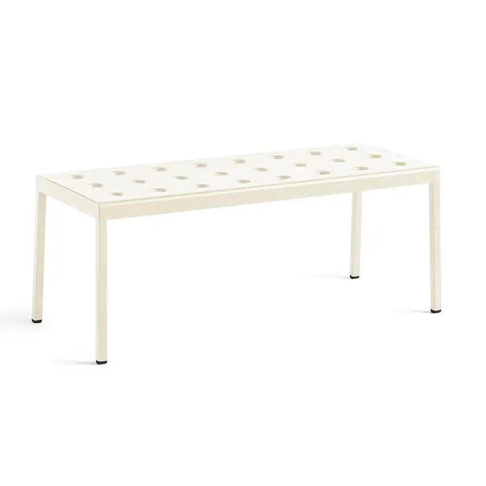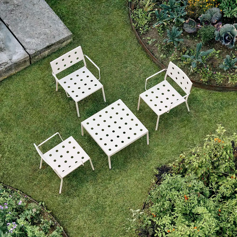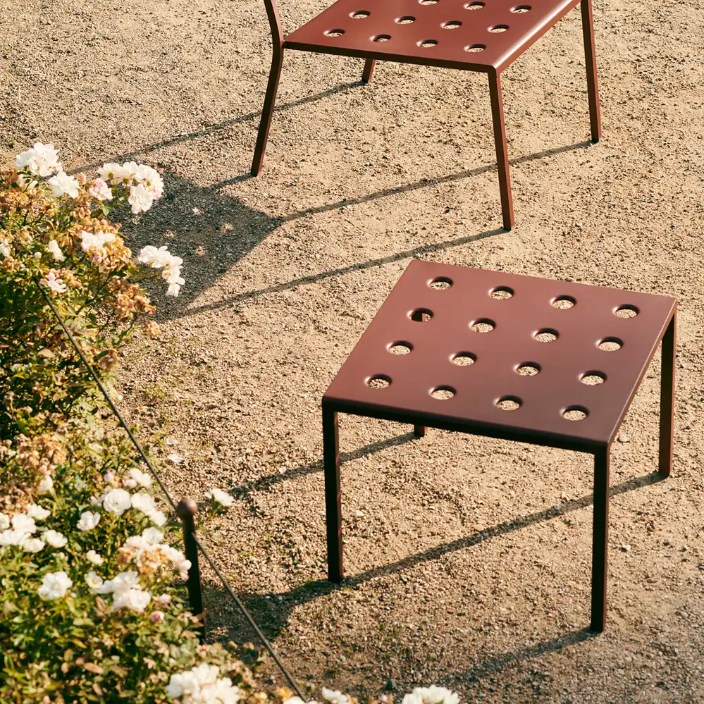 Der Balcony Low Table, entworfen von Ronan und Erwan Bouroullec für HAY, ist eine Serie von niedrigen Outdoor-Tischen. Die klaren, quadratische Form wird durch mehrere Öffnungen in der Tischplatte ergänzt, die nicht nur eine markante Optik schaffen, sondern auch die Stabilität der Konstruktion erhöhen. Gefertigt aus pulverbeschichtetem Stahl und mit einem Outdoor-Primer versehen, bietet der Tisch hohe Widerstandsfähigkeit und Langlebigkeit im Außenbereich. Der Balcony Low Table ist in verschiedenen Größen und Farbvarianten erhältlich und eignet sich dank seines vielseitigen Designs für unterschiedlichste Einsatzorte - von kleinen Balkonen und Terrassen bis hin zu Gärten und großzügigen Außenflächen