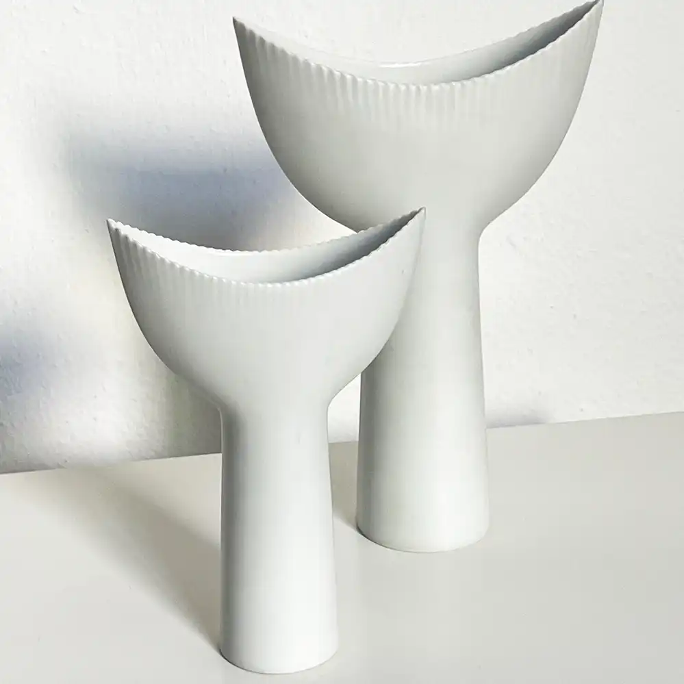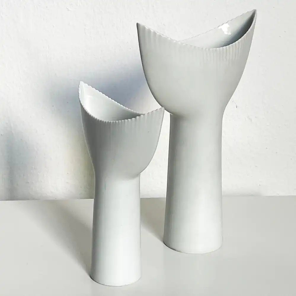 Vermutlich in den 1950er Jahren entwarf Tapio Wirkkala für Rosenthal die Haifischzähne-Vase aus mattem Porzellan. Der Preis gilt für das Set von zwei Vasen.