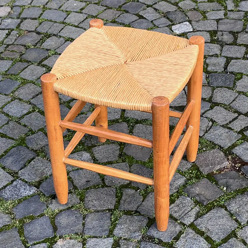 In den 1930er Jahren entwickelte Charlotte Perriand eine rustikal anmutende Möbelkollektion, die auch diesen Hocker umfasste. Das Gestell besteht aus Esche, die Beine laufen abgerundet zum Boden und sind durch Querstreben verbunden. Der Sitz besteht aus Stroh, welches nach der ursprünglichen Technik restauriert wurde. Hergestellt wurde der Hocker von Sentou vermutlich in den 1960er Jahren.