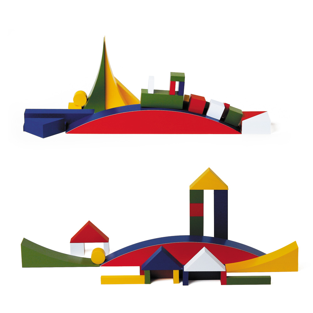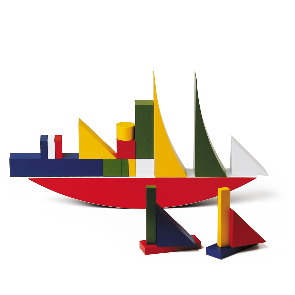 1924 entwarf Alma Siedhoff-Buscher in der Bauhaus-Werkstatt in Weimar im Rahmen des kunstpädagogischen Konzeptes dieses Bauspiel. Es wurde erstmalig als Teil des Kinderzimmers im Bauhaus Musterhaus „Haus am Horn“ 1923 in Weimar gezeigt (heute UNESCO-Weltkulturerbe). Die Spielobjekte des Bauhauses waren aus Holz und in kräftigen Farben gehalten, um die Phantasie anzuregen und um das Vorstellungsvermögen zu schärfen. Mit den beliebig zusammensetzbaren Bauklötzen lassen sich Schiffe, Häuser oder Phantasiegebilde bilden. „bauspiel: ein schiff - das auch eine berg und talbahn, ein tor, ein tier und vieles sonst noch sein kann.” so Alma Siedhoff-Buscher damals über ihren vielbeachteten Entwurf in der typischen Bauhaus-Kleinschreibung.
