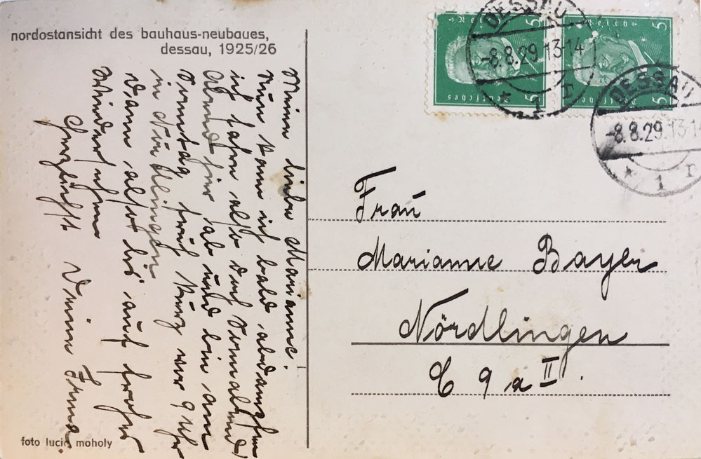 Das Original-Foto zeigt die Ansicht des Bauhaus-Gebäudes von Nordosten um 1926 und wurde von Lucia Moholy erstellt. Hergestellt wurde das Silbergelatinefoto in der Bauhauswerkstatt, wie die Kleinschreibung auf der Rückseite schon vermuten lässt und uns vom Bauhaus Archiv bestätigt wurde. Das als Postkarte genutzte Foto zählte zur Serie der sogenannten Bauhauspostkarten. Interessanterweise gibt es von der Abbildung zwei Varianten aus den 1920er Jahren – einmal mit und ohne Baugerüst vor dem Prellerhaus. Bei diesen Foto ist das Baugerüst noch vorhanden, bei späteren Kupfertiefdruck-Postkarten wurde das Gerüst wegretuschiert, wie uns das Bauhaus Archiv Berlin Anfang Juni 2019 schriftlich bestätigte.*