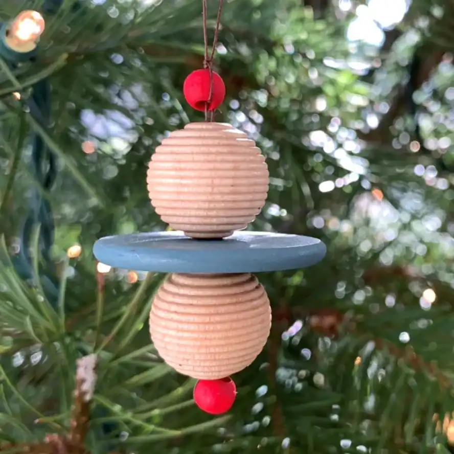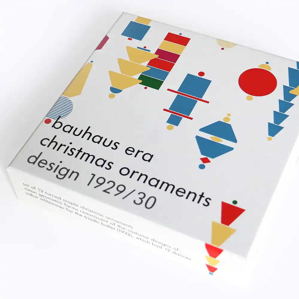 Mit ihrem geometrischen Formen erinnern die gedrechselten Weihnachtsornamente aus Ahornholz entfernt an die Kostümentwürfe von Oskar Schlemmer für das Triadische Ballett. Der Entwurf der um 1929/30 entworfenen Ornamente werden dem Architekten Johannes Gabriel zugeschrieben. Die Originale stammen aus dem Nachlass eines Kölner Architekten, der eine umfangreiche Bauhaus-Sammlig hatte. Wr weitere Informationen zu dem Entwerfer Johannes Gabriel hat, bitte gerne melden.
