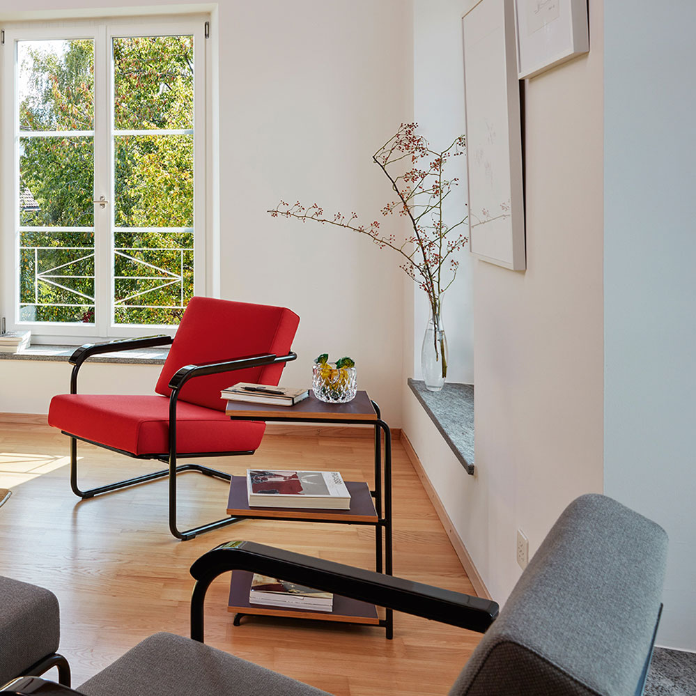 Werner Max Moser entwarf für Embru eine ganze Reihe von Möbeln. Seine Entwürfe waren – trotz der Nähe zu den bekannten Bauhaus-Modellen – immer geprägt vom schweizerischen Gedanken des praktischen Möbels. Entweder verstellbar, speziell stapelbar oder mehrfach nutzbar. So der kleine Beistelltisch 120 – er entstand 1931 und wurde in verschiedenen Oberflächenvarianten angeboten. Durch das Aneinanderstellen von zwei Tischen wird aus dem auskragenden Einzelstück ein in sich geschlossenes Staumöbel – auch diese Mehrfachverwendung ist typisch für die damalige Schweizer Haltung.