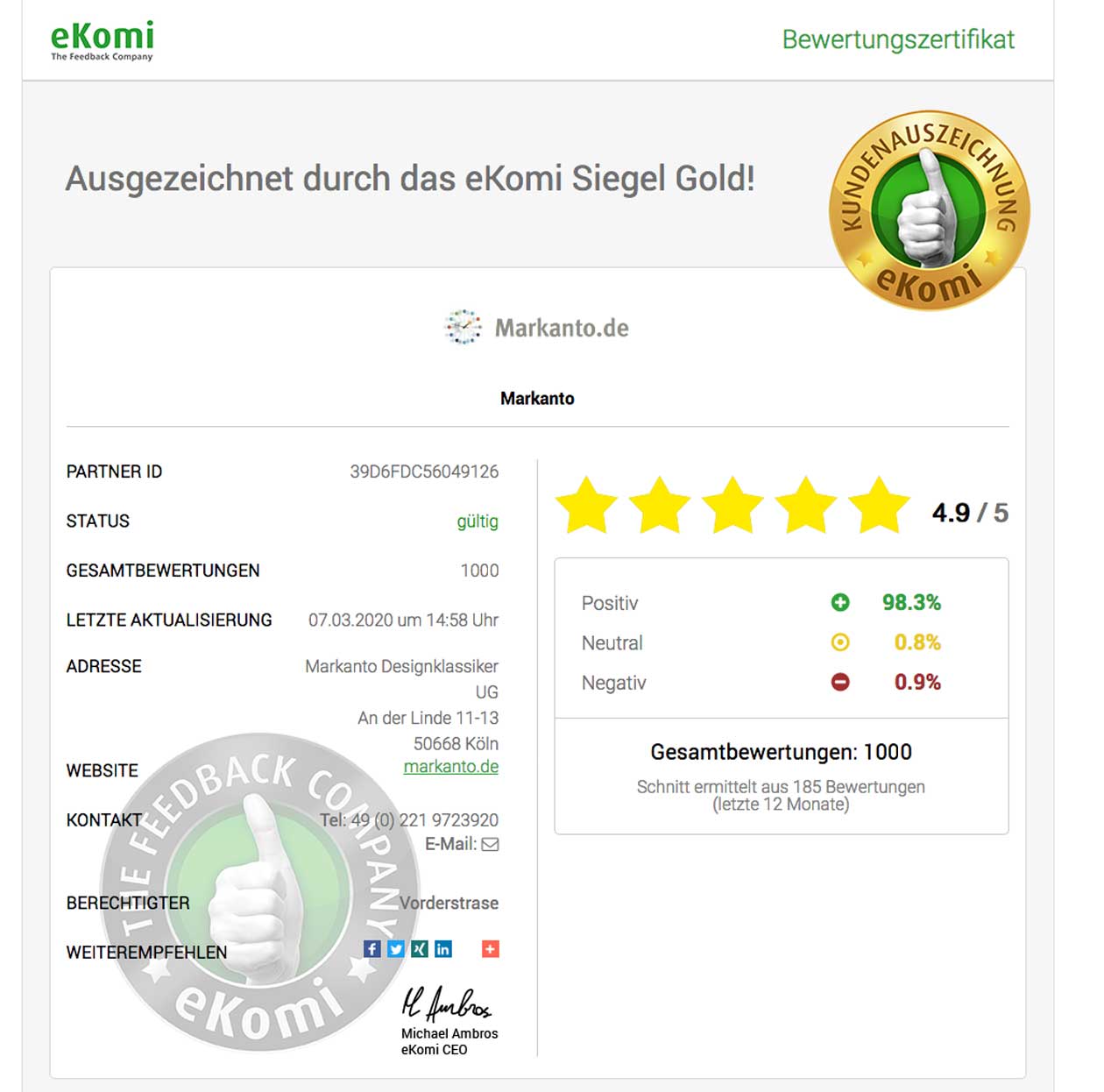 Wir freuen uns, dass 98,3% aller Kundenbewertungen durchweg positiv sind und danken Ihnen allen ganz herzlich. Alle Bewertungen sind bei uns selbstverständlich echt und stammen wirklich von unseren Kundinnen und Kunden. Das durchdachte eKomi System lässt auch keine Fake-Bewertungen zu, so können schlechte Bewertungen nicht gelöscht werden. Nur bei Bewertungen, wo Kunden sich offensichtlich vertan haben, ist bei eKomi ein Einspruch oder eine Änderung möglich. Exemplarisch kam es in der Vergangenheit öfters vor, dass Kunden uns nur mit einem Stern bewerteten, was bei eKomi die schlechteste Bewertung ist. Auf Nachfrage stellte sich heraus, dass diese Kunden dachten, dass ein Stern - wie bei Schulnoten - die beste Kundenbewertung sei. Diese offensichtlich falsche Bewertung wurde dann durch eKomi gelöscht, anschließend bekamen die betroffenen Kunden nach Aufklärung alle einen neuen Bewertungslink gesendet. eKomi selbst ist dabei eine neutrale Institution.