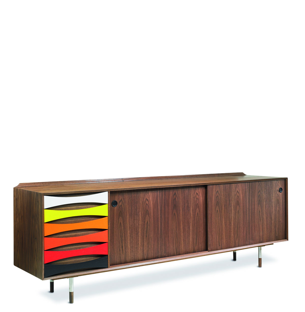 Besonders deutlich wird Arne Vodders Beitrag im Bereich der Aufbewahrungsmöbel – Sideboards, Highboards, Schreibtische. Diese Objekte sind keine bloßen Stauraumlösungen, sondern räumliche Ordnungssysteme. Besinders hervorzuheben ist das sogenannte Vodder Sideboard, ausgezeichnet auf der Tiennale in Mailand, (Abbildung oben), mit dem typischen Farbverlauf, den Vodder wohl von Finn Juhl übernommen hatte. Seine Möbelentwürfe, meist produziert von Sibast Furniture, folgen einer klaren konstruktiven Logik. Die Fronten erscheinen geschlossen und ruhig, während das Innere differenziert organisiert ist. Dieses Wechselspiel zwischen äußerer Reduktion und innerer Komplexität verweist auf ein zentrales Motiv: Ordnung als kulturelle Praxis, nicht als visuelle Strenge. Arne Vodder gestaltet Möbel, die Verhalten strukturieren. Schubladenhöhen, Fachteilungen und Proportionen sind so angelegt, dass sie bestimmte Formen der Nutzung nahelegen. Ordnung wird hier nicht moralisch eingefordert, sondern konstruktiv vorbereitet. Die häufig weich auslaufenden Kanten seiner Arbeiten reduzieren nicht allein Verletzungsgefahr oder visuelle Härte, sondern erzeugen eine kontinuierliche Lichtbrechung. Dadurch verlieren die Möbel ihre Massivität; sie erscheinen leichter, beinahe schwebend. Diese subtile Bearbeitung lässt sich als Form taktiler Intelligenz verstehen: Die Möbel adressieren nicht nur den Blick, sondern die Hand. In einer Zeit zunehmender Industrialisierung bleibt bei Vodder das haptische Erlebnis integraler Bestandteil der Gestaltung.