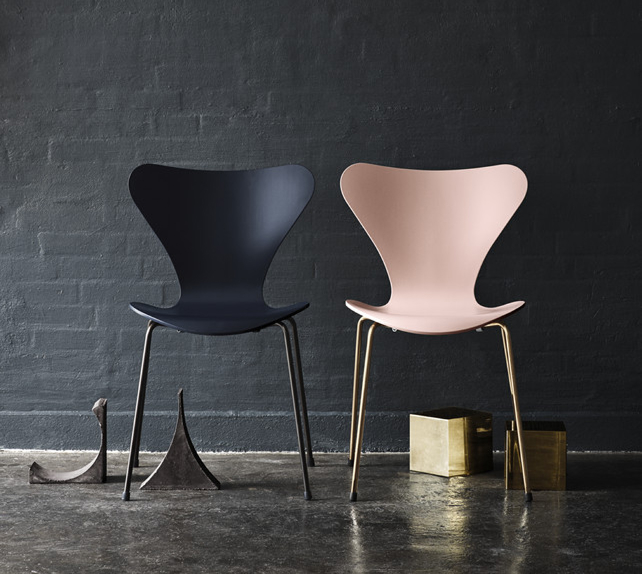 Die Jubiläumsedition 60 Jahre Serie 7 von Fritz Hansen ist inspiriert von dem Sprichwort „Gegensätze ziehen sich an“. Bei den Jubiläumsmodellen dreht sich alles um Kontraste – sowohl bei den Materialien als auch bei den Farben. Einerseits stehen Dunkelblau und Zartrosa in Kontrast zueinander, andererseits interagieren sie und erzeugen einen eleganten Look. Zum 60-jährigen Jubiläum des legendären Designklassikers ist an jedem Exemplar eine goldene Platte an der Unterseite der Sitzschale angebracht. Erhältlich ist die Edition das ganze Jahr 2015.