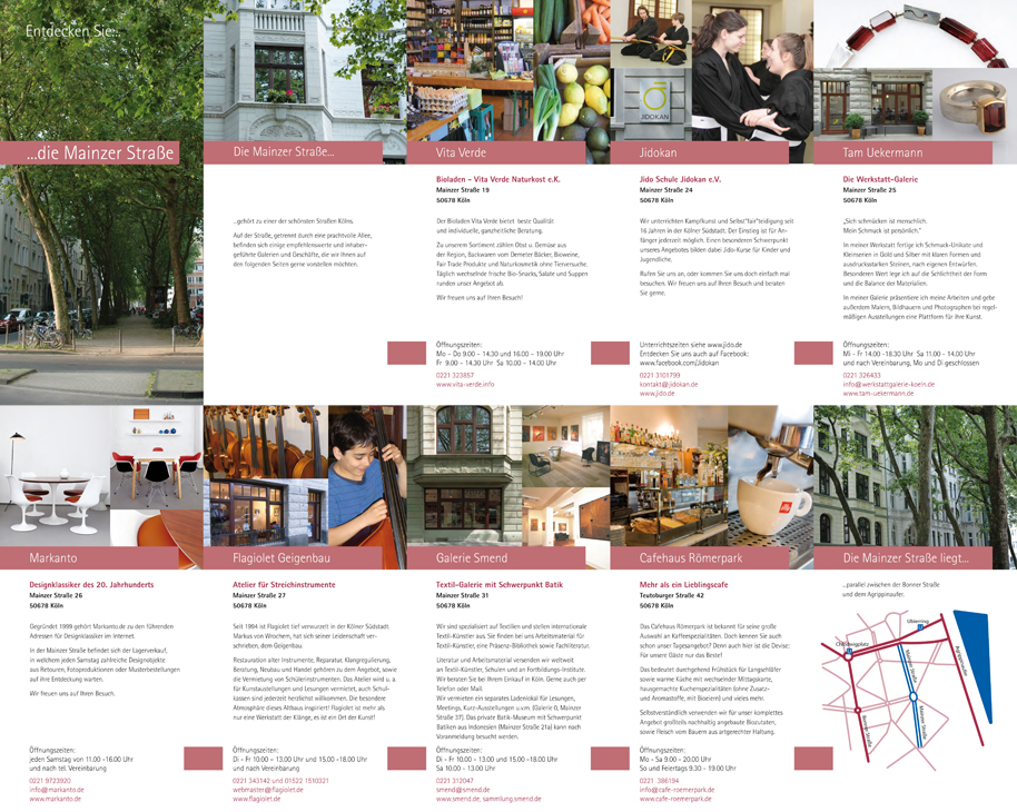 In eigener Sache: Immer wieder schreiben wir, dass die Mainzer Straße eine von Kölns schönsten Straßen sei. Zusammen mit anderen inhabergeführten Galerien und Geschäften auf der Mainzer Straße haben wir nun eine kleine Gemeinschaftswerbung entwickelt. Neben dem Markanto Depot finden Sie auf der Mainzer Straße u.a. den Bioladen Vita Verde, die Kampfkunstschule Jidokan, die Werkstatt-Galerie Tam Uekermann, Flagiolet Geigenbau, die Textilgalerie Smend und unser aller Lieblingscafe Römerpark. Also, entdeckten Sie die Mainzer Straße!