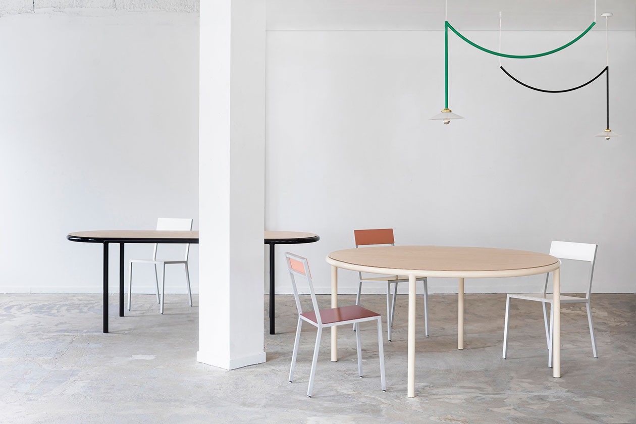 2020 präsentierte die belgische Marke valerie_objects erstmalig den Tisch Wooden Table von Fien Muller und Hannes Van Severen. Der Name bezieht sich dabei auf das abgerundete Stahlrohr der Tische, die in drei verschiedenen Varianten (Round Wooden Table, Oval Wooden Table und Rectangular Wooden Tables) erhältlich sind. Die Tischplatten sind dabei wahlweise in einer hellen Birke, einer klassischen Eiche, einer stilvollen Walnuss und einer dunkleren Kirsche möglich, das Gestell ist in den Farben Creme, Grün, Rot und Schwarz. Es ist das erste Mal, dass Muller Van Severen Holz in ihrem Design verwenden, dennoch bleibt ihr charakteristischer Stil unberührt. Der dazu passende Stuhl ist der minimalistische Alu Chair, der in einer durchdachten Farbkomposition in 16 Farben möglich ist. Das Design reduziert den Stuhl wirklich auf ein Minimum und erinnert vom Ansatz an die arbeiten von Donald Judd.