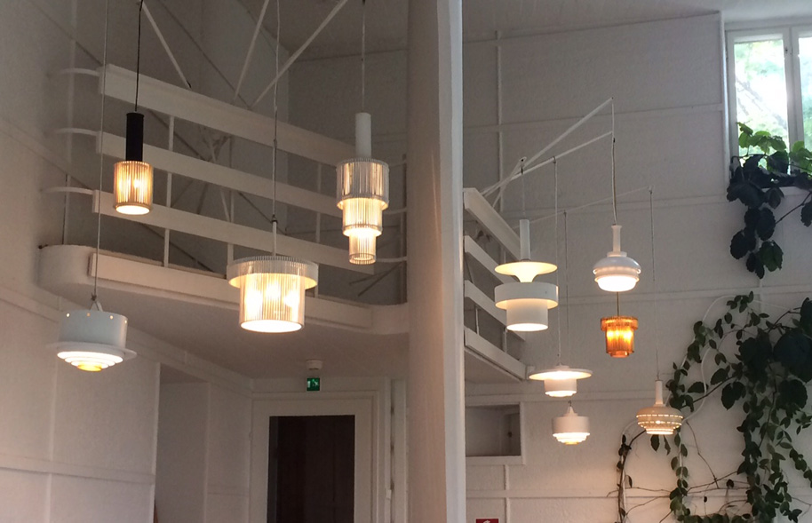 Sowohl im Wohnhaus wie im Atelier befinden sich zahlreiche Leuchtenentwürfe von Aalto, wovon selbst wir einige Modelle noch nicht kannten. Abgerundet wird die Innengestaltung durch dekorative Elemente wie Aaltos Wandskulpturen aus geformtem Birkenholz.