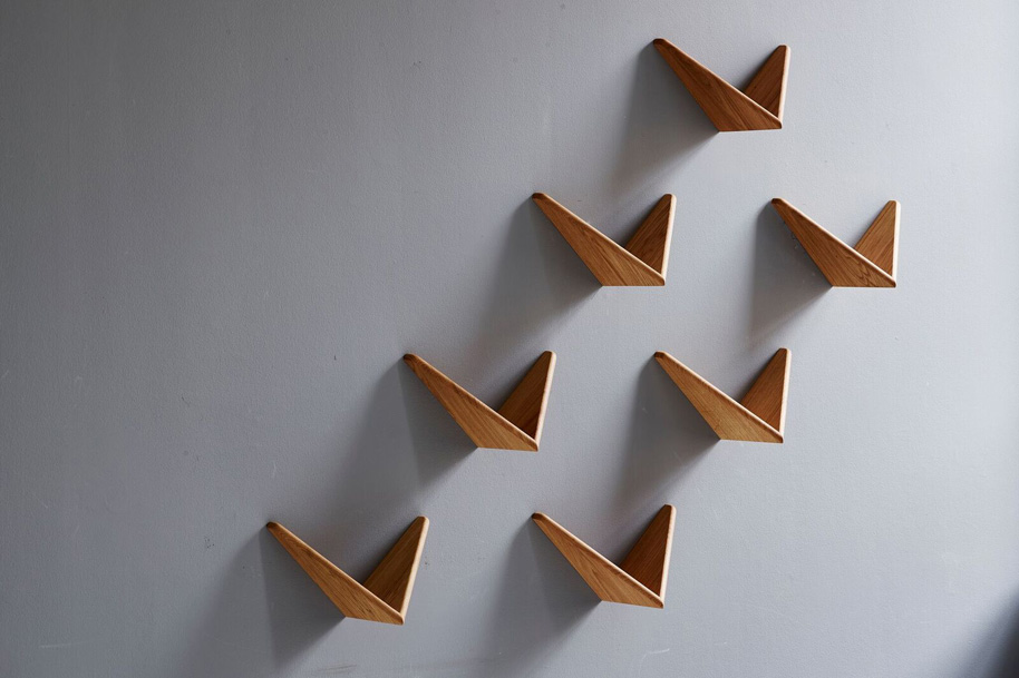Die Holzelemente des Butterfly Wandregals von Poul Cadovius, welche auf verspielte Art und Weise auch an einen Papierflieger erinnern, kann man auch nur zur Dekoration verwenden und sie somit umgekehrt an der Wand anbringen.
