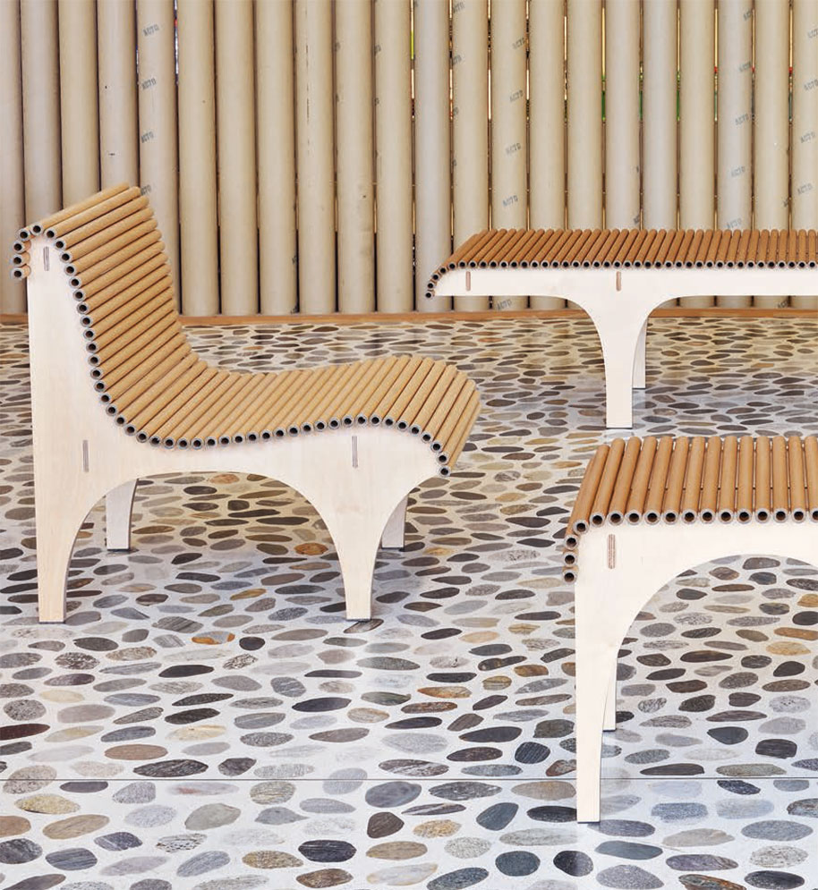Gedacht ist die Carta Kollektion für den Indoorbereich wie für private Interoirs (Wohnzimmer, Esszimmer, Entrée oder Loungebereich) und natürlich für ökologisch ausgerichtete Firmen und Institutionen (Empfangsbereiche oder Foyer). Die Pappmöbel nämlich wasser- und schmutzabweisend, die einzelnen Papertubes sind