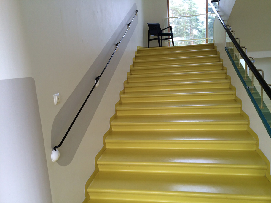 Farbgebung im Treppenhaus der Paimio Klinik (auch das linke Treppengeländer stammt von Alvar Aalto)