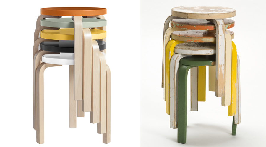 Die rechte Abbildung zeigt natürlich Vintage-Hocker der Artek-Initiative 2nd Cycle.