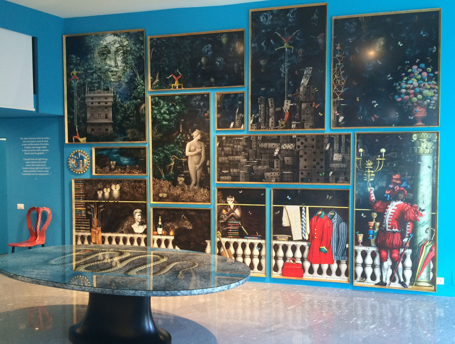 Weiter ging es nach Milano, wo wir den neuen Fornasetti Showroom begutachteten. Die Fornasetti Welt erstreckt sich dort über drei Etagen und je höher man kommt, desto beeindruckender sind die Installationen. Besonders imposant fanden wir das grüne Zimmer – ein Gesamtkunstwerk mit Möbeln von Gio Ponti und Piero Fornasetti, bezogen mit einem psychodelischen Dekor des Meisters, was sich selbst auf den Wänden wieder findet. Aber auch die anderen Räume gaben die Fornasetti Welt wirkungsvoll wieder wie der blaue Salon mit Fornasetti Motiven in einer sogenannten englischen Rahmung.