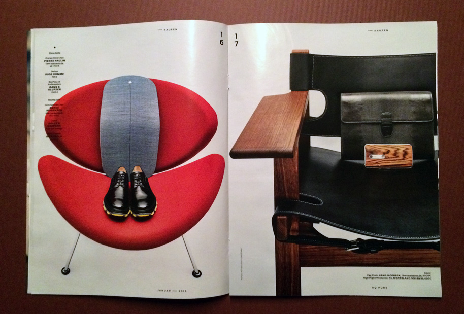 Für die Januar Ausgabe der GQ Deutschland haben wir einige ausgewählte Designklassiker zur Verfügung gestellt – die Titelseite zeigt das Ei von Arne Jacobsen in der limitierten Version Fritz Hansen’s Choice.Im Innenleben des neuen GQ Supplements PURE Zeitgemässer Luxus geht es auf sechs Seiten weiter.