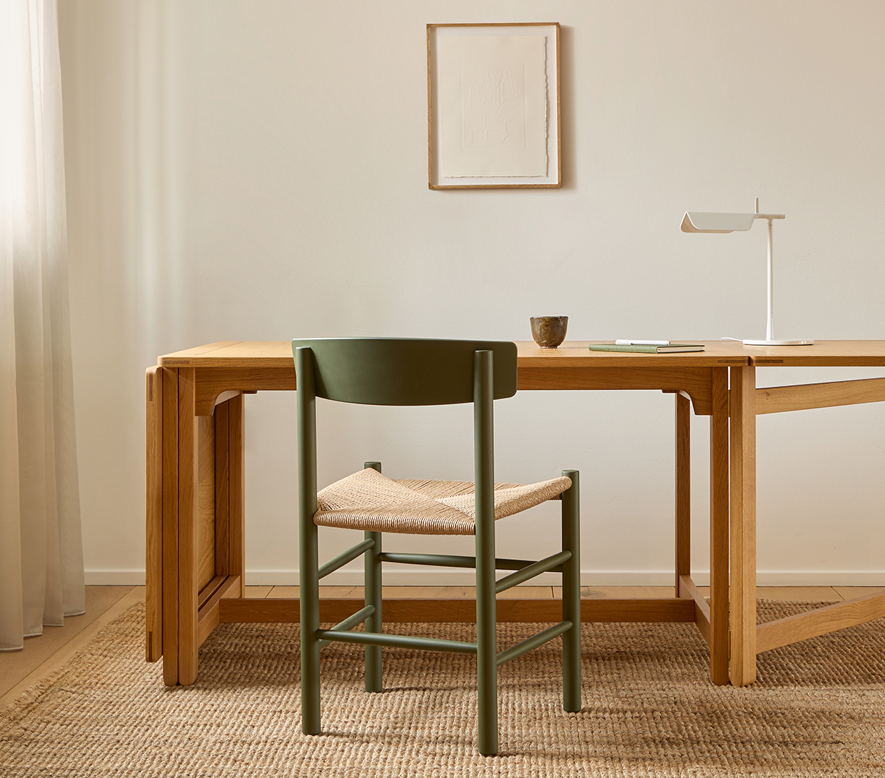 Hergestellt wird der dänische Designklassiker immer noch von Fredericia – wahlweise in wie FSC®-zertifizierter Eiche, Nussbaum und Buche. Während des gesamten Herstellungsprozesses weist der Stuhl dabei einen sehr geringen CO2-Fußabdruck auf. Seit diesem Frühjahr präsentiert sich der J39 in zwei neuen Farben und einer Lackvariante – zwei weitere Farben kommen im Herbst auf den Markt. Die neuen Ausführungen zeichnen sich durch Lackierungen auf Wasserbasis aus, die auf Buchenholz lackiert sind und dadurch eine schöne, glatte Oberfläche und dezente, gedämpfte Farben wie das o.g, abgebildete Kakigrün bieten. Die neuen Farben wurden durch das charaktervolle Landhaus und Atelier von Børge Mogensen in Lynderup am Limfjord inspiriert. Die sorgfältig ausgewählten Materialien und Farben dieses im Jahr 1969 fertiggestellten Hauses schaffen in Verbindung mit dem sanften Licht eine einzigartige Atmosphäre, die Mogensens besonderen Sinn für Ästhetik unterstreicht. Inmitten der wilden und schönen Landschaft mit Blick auf den Fjord hatte Mogensen ein Refugium aus Holz, Ziegelsteinen und Klinker in Kombination mit einer unprätentiösen Einrichtung in gedeckten Farben geschaffen, das zum Entspannen und zur vertieften Beschäftigung einlädt.